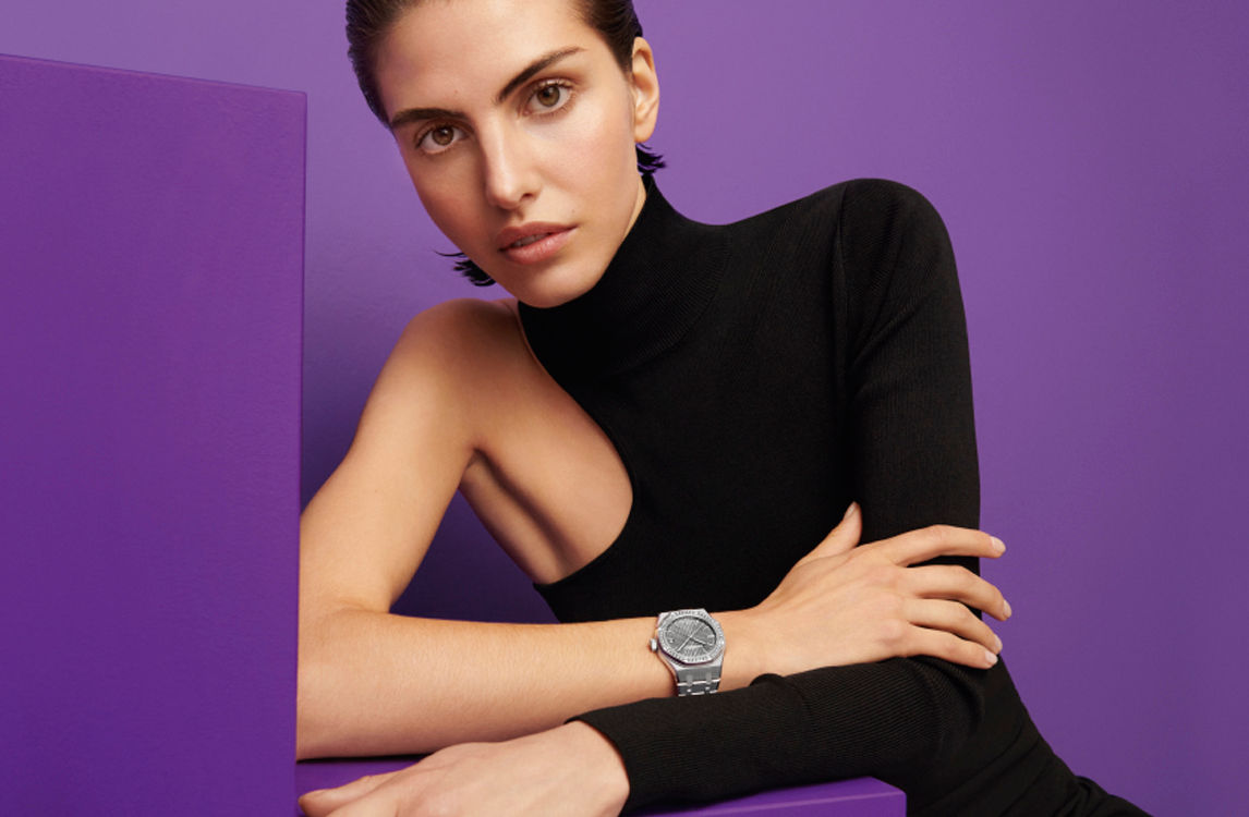 This tone-on-tone 37 mm model marries stainless steel with a diamond-set bezel and a grey “Grande Tapisserie” dial. It incorporates the latest Royal Oak design evolution as well as the selfwinding Calibre 5900.