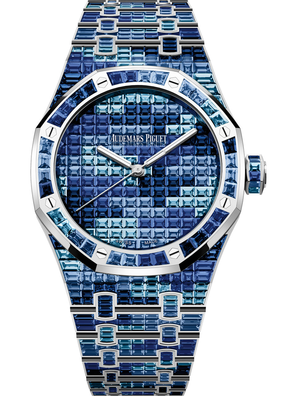Dial set with baguette-cut graded blue sapphires and Swiss blue topaz, white gold Royal Oak hands with luminescent coating.