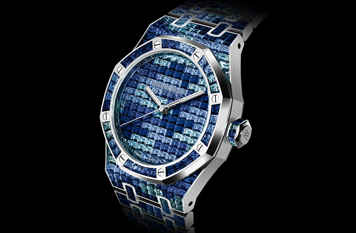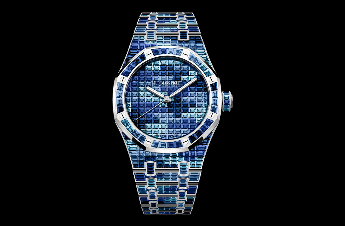 This 41 mm 18-carat white gold Royal Oak Selfwinding displays a unique camouflage pattern created by baguette-cut graded blue sapphires and Swiss blue topaz set evenly throughout the watch.