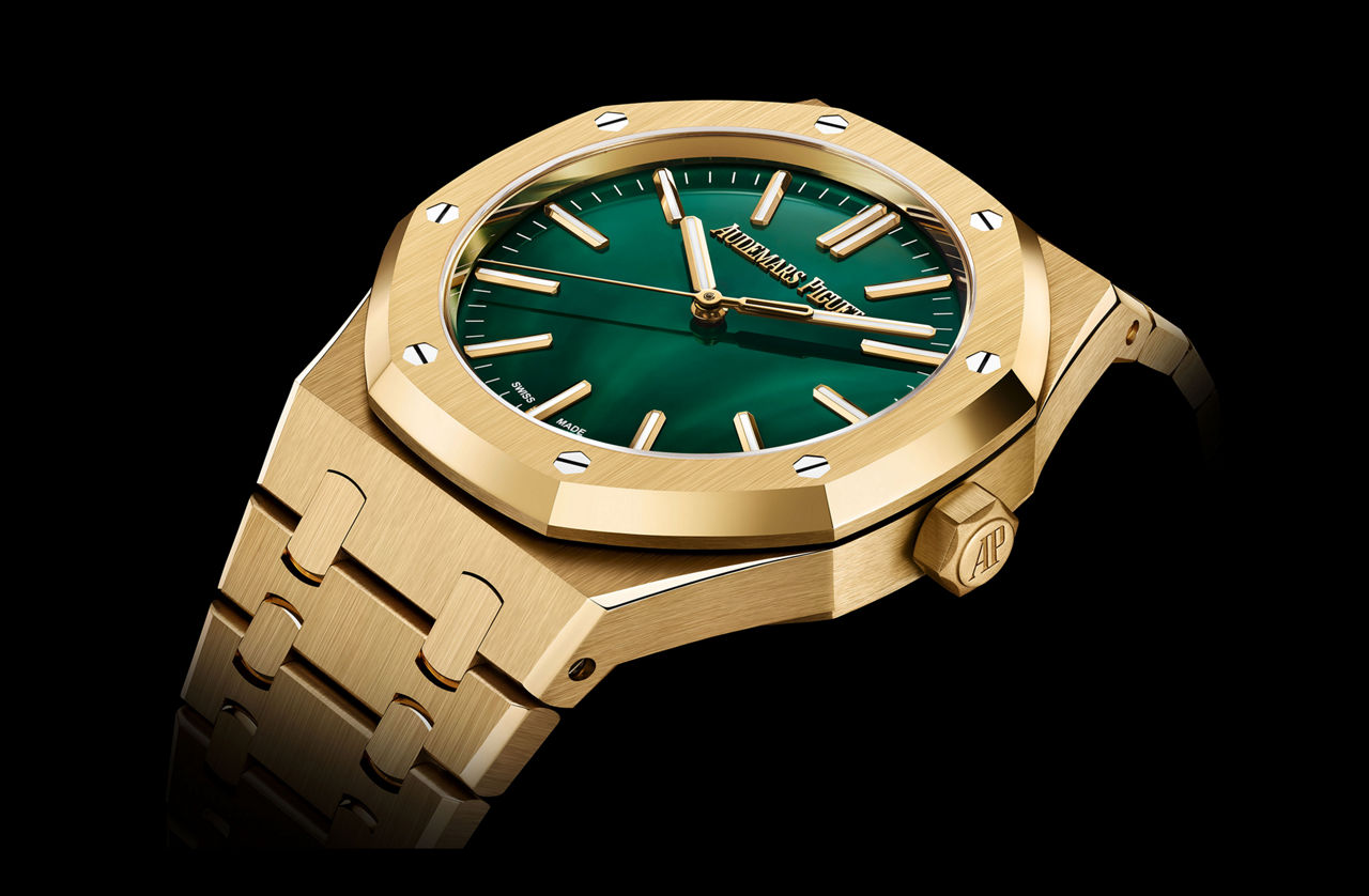 The natural malachite stone dial is complemented by 18-carat yellow gold hands and hour-markers filled with luminescent material, and a yellow gold-toned inner bezel.