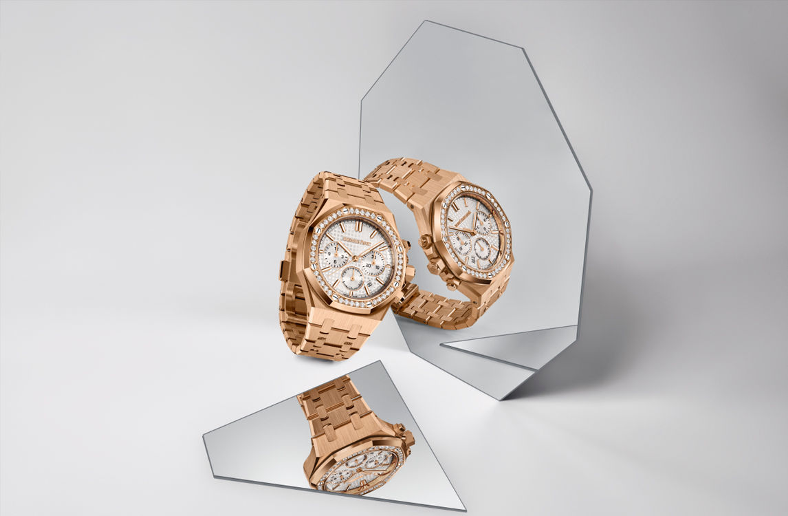 The pink gold case and bracelet of this 38 mm Chronograph are enriched with a diamond-set bezel and a silver-toned “Grande Tapisserie” dial. The new Royal Oak design evolution bestows the watch with a slenderer aesthetic.