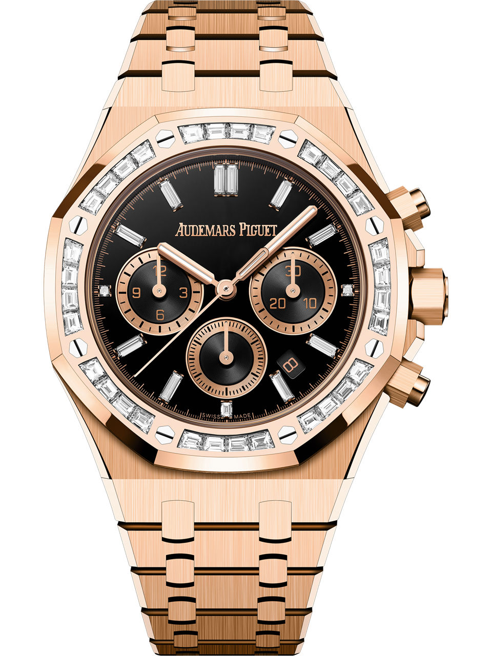 Featuring a jet-black onyx dial dressed with baguette-cut diamonds, this pink gold Royal Oak Selfwinding Chronograph brings a touch of elegance to this iconic sports watch.