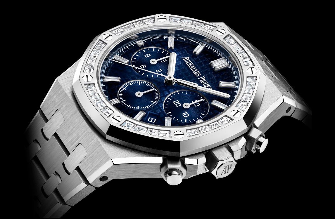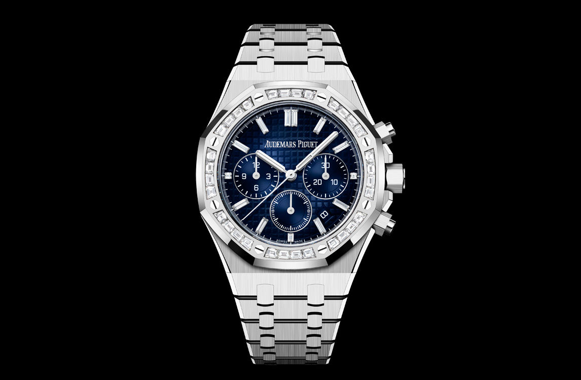 Smoked blue dial with “Grande Tapisserie” pattern, blue counters and external zone, baguette-cut diamond hour-markers, white gold Royal Oak hands with luminescent coating.
