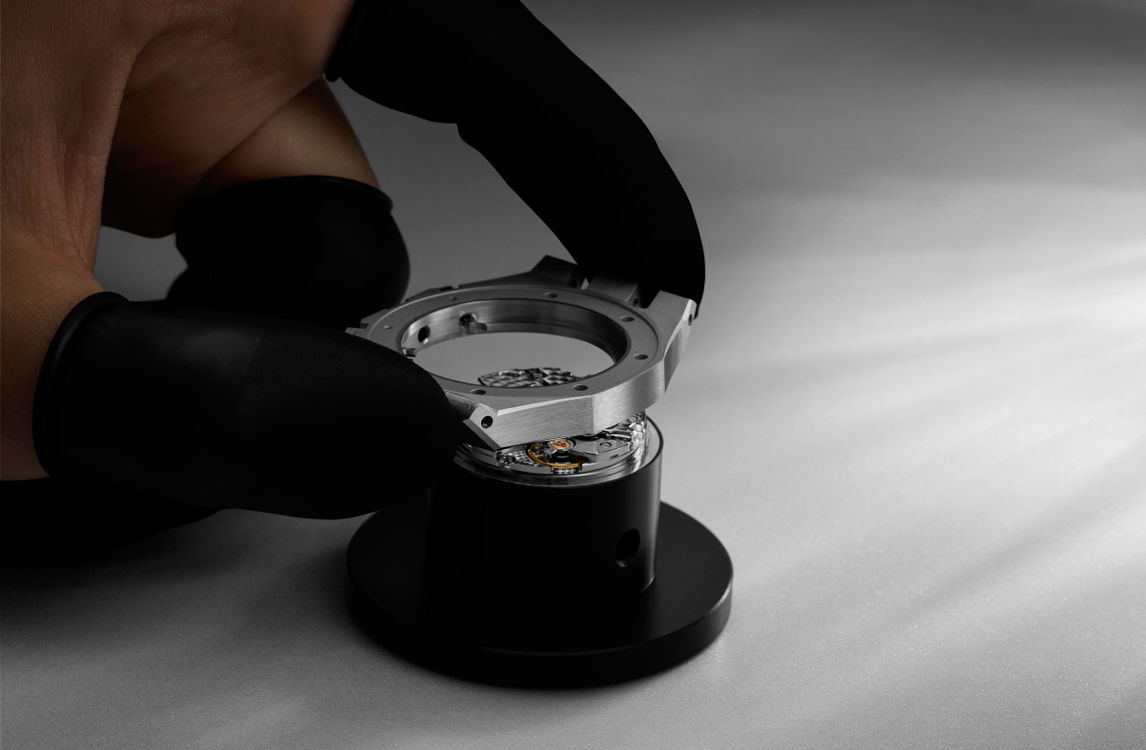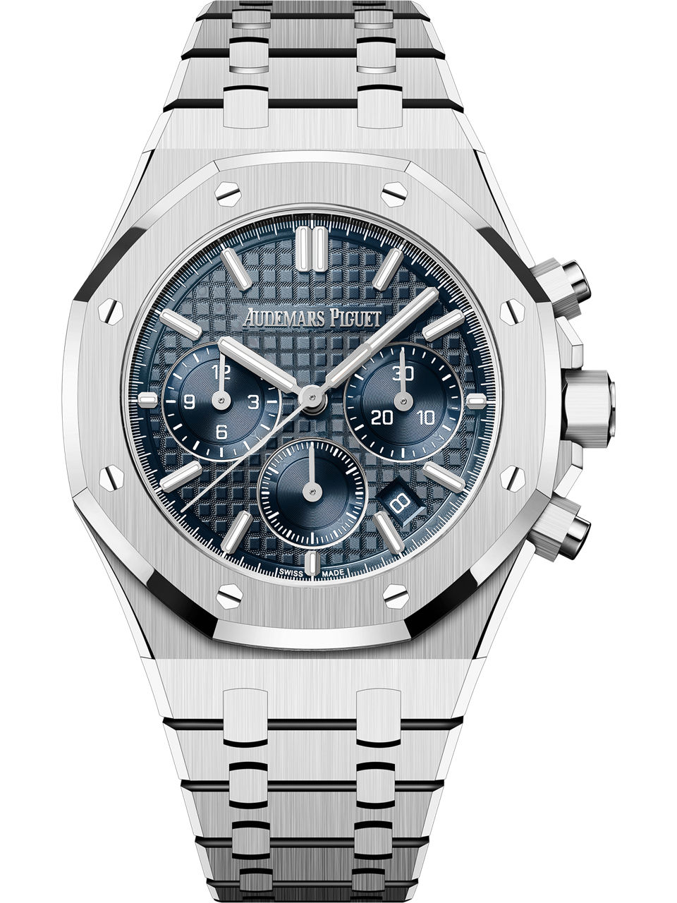 “Bleu nuit nuage 50” dial with “Grande Tapisserie” pattern, “Bleu nuit nuage 50” counters, white gold applied hour-markers and Royal Oak hands with luminescent coating.