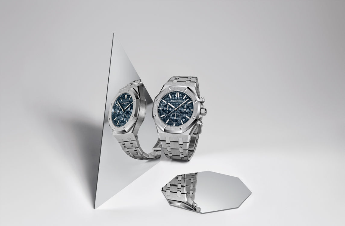 Although benefitting from the new Royal Oak design evolution, this 38 mm Chronograph is inspired by the original timepiece with a stainless steel case and bracelet enhanced by a “Grande Tapisserie” dial adorning the iconic Bleu Nuit, Nuage 50 hue.