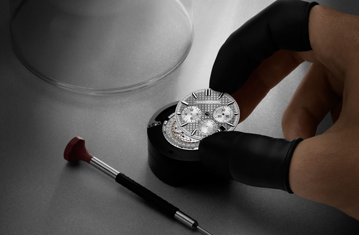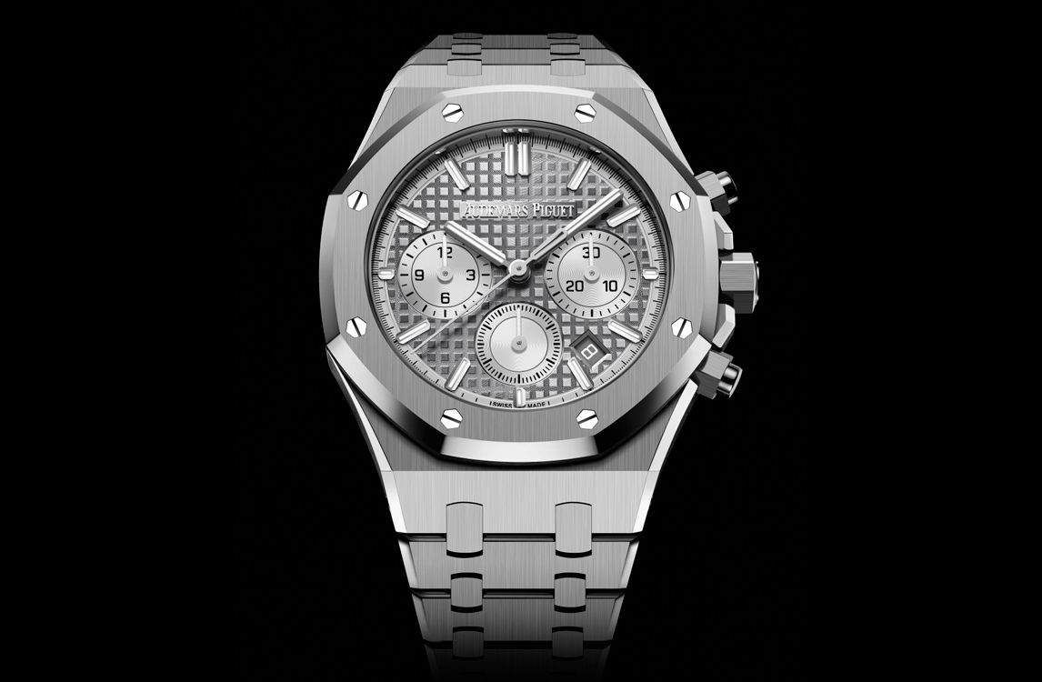 Grey dial with “Grande Tapisserie” pattern, silver-toned counters, white gold applied hour-markers and Royal Oak hands with luminescent coating.