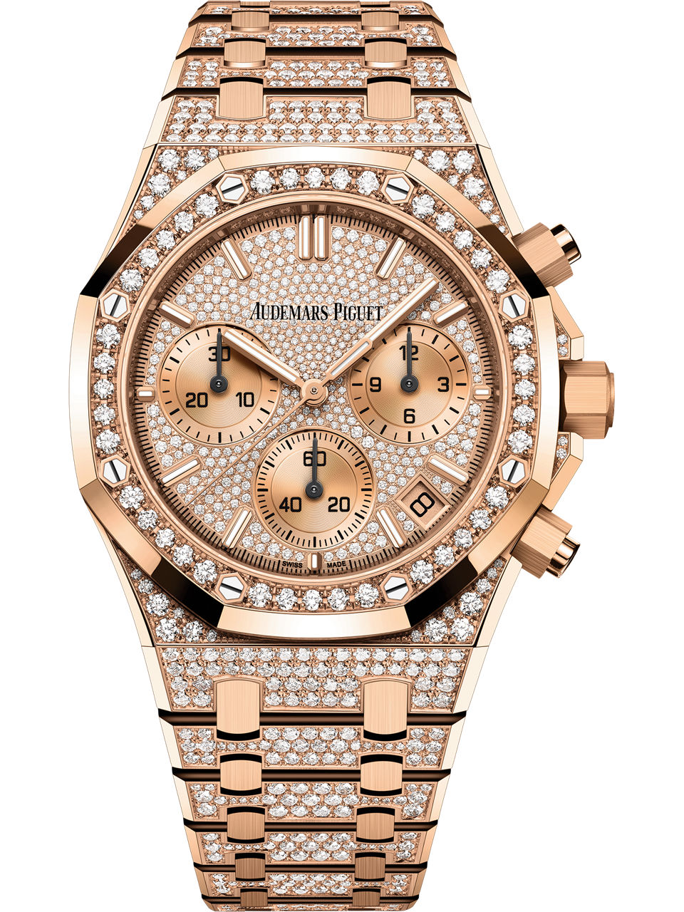 This 18-carat pink gold 41 mm selfwinding chronograph is fully set with brilliant-cut diamonds. The latest Royal Oak design evolution furthers the watch’s slender and elegant aesthetic.