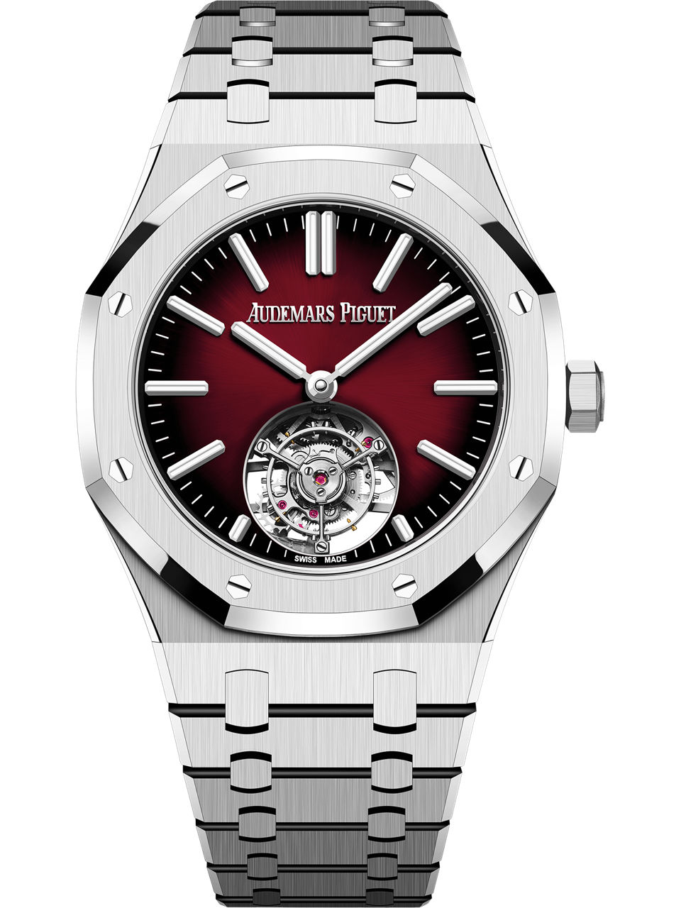 This 41 mm Royal Oak Selfwinding Flying Tourbillon brings together stainless steel with a smoked burgundy dial for a striking contrast.