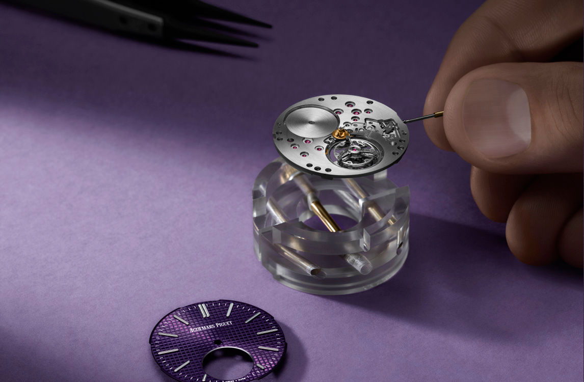 This extra-thin 37 mm Royal Oak, powered by Calibre 2968, embodies the Manufacture's first ever selfwinding flying tourbillon offered in a 37 mm diameter. Endowed with a new plum "Petite Tapisserie" dial and an innovative escapement system, this stainless steel timepiece blends technical feats with meticulous aesthetic.