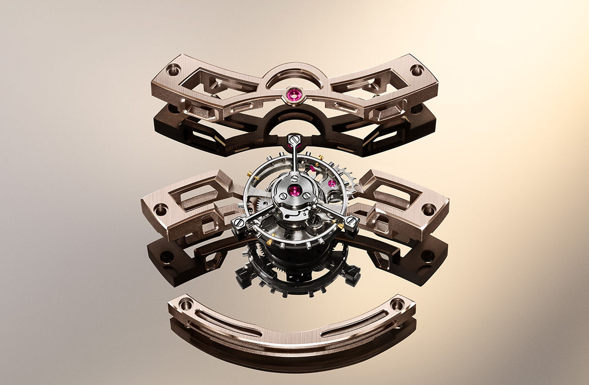 This 41 mm timepiece is crafted in sand gold, a new 18-carat gold alloy that hovers between white and pink gold and plays with the light. Its multilayered, openworked movement pairs sand-gold-toned and rhodium-toned hues.