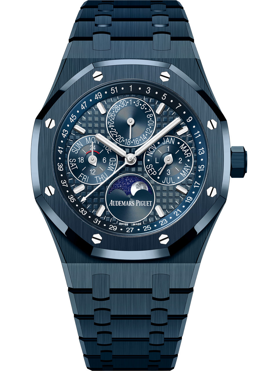 Combining refined aesthetics with technical mastery, this 41 mm Perpetual Calendar is crafted entirely in “Bleu Nuit, Nuage 50” ceramic and powered by Calibre 7138. The innovative "all-in-one" crown adjustment system and harmonious Grande Tapisserie dial bring together cutting-edge technology and traditional hand-finishing, reflecting Audemars Piguet’s uncompromising pursuit of excellence.