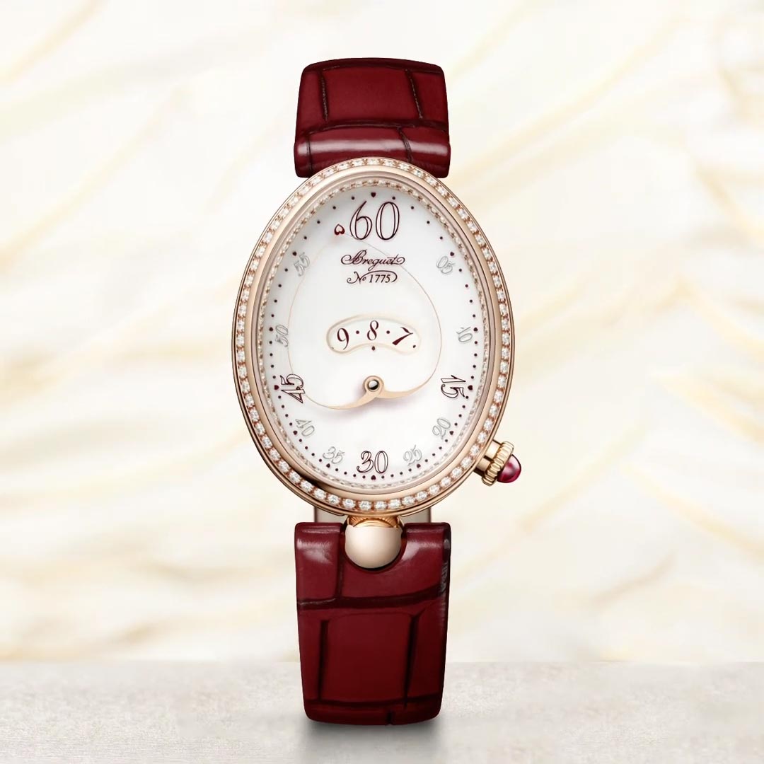 Rose gold and diamonds add to the radiance of this sleek creation, with a hint of vermilion. This exclusive Cœur, or Heart edition, limited to 28 numbered pieces and accompanied by a matching clutch as its case, is reserved for a selection of Breguet boutiques.The first wristwatch ever made, the model no. 2639 was a treasure trove of ingenuity right from its origins in 1810. Breguet was inspired by this innovative watch and by the client, Caroline Murat, Queen of Naples, who commissioned it, for its iconic contemporary collection.