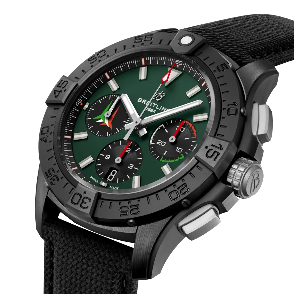 Built for jet pilots, the Avenger is designed to take on the toughest cockpits and keep coming back for more. This edition is dedicated to the Frecce Tricolori, the famous Italian aerobatic squadron who captivates audiences worldwide with its breathtaking displays of skill and precision. But you don’t need military credentials to appreciate its bold design, exceptional resilience, and next-level functionality. This execution showcases a matte green dial adorned with the Frecce Tricolori’s emblem as well as a dedicated engraving surrounding the open caseback view of the Breitling Manufacture Caliber 01. It features a black ceramic case and titanium hardware accompanied by a military leather strap. And whether you can pull off a barrel roll or not, you’ll appreciate everything about its 300 m water resistance, easy-grip functionality, and corrosion-resistant construction.