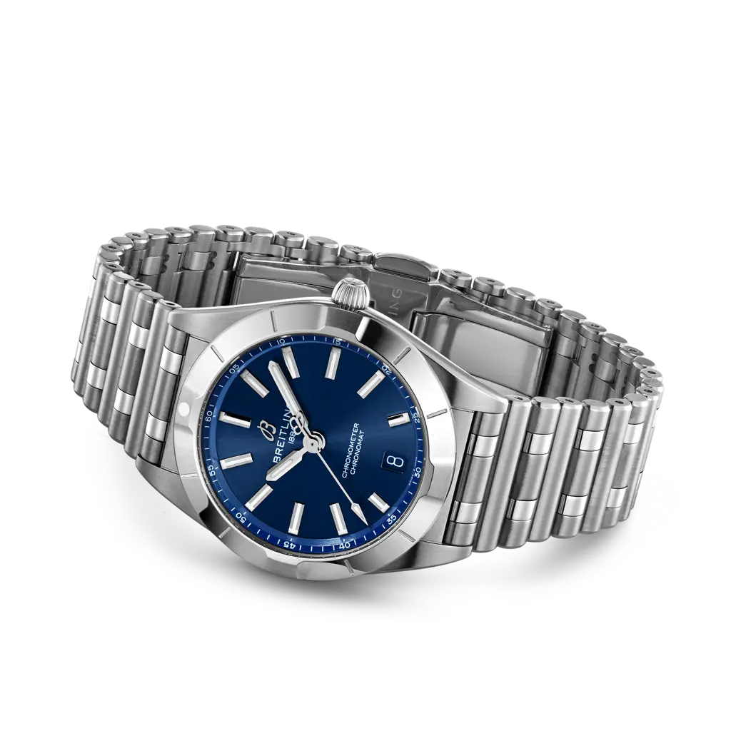 Stylish yet elegant, the modern-retro inspired Chronomat 32 is the versatile sporty and chic watch for any occasion. It is available in an array of metal cases, from cool stainless steel, to goes-with-everything bicolor, or even luxurious 18k red gold. Women craving extra sparkle will also be able to opt for diamond-set bezels, indices, and colorful dials. Featuring Breitling’s iconic and comfortable “Rouleaux” bracelet with a butterfly clasp, the Chronomat 32 is powered by the Breitling Caliber 77, a COSC-certified SuperQuartz™ chronometer.