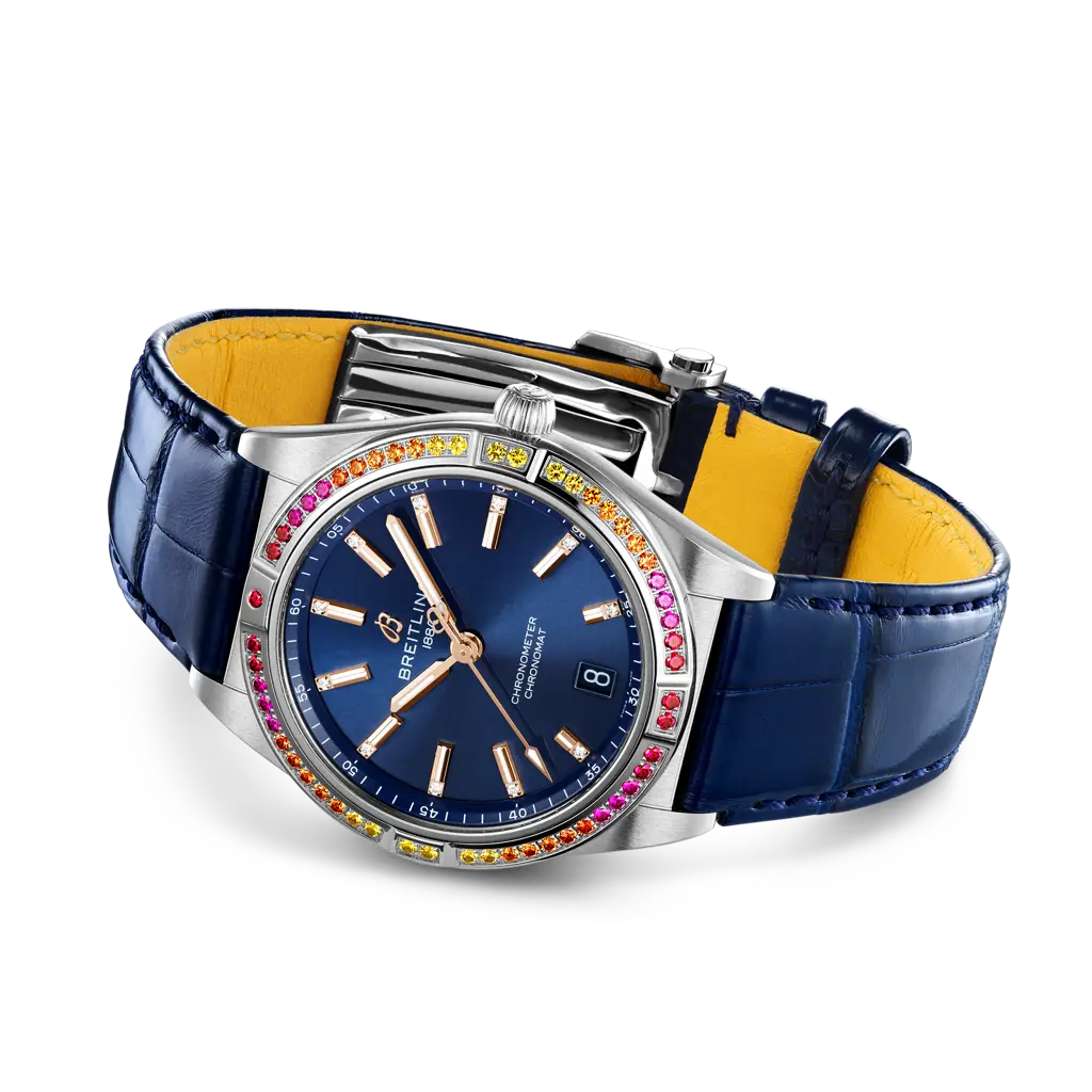 With eye-catching colors and luminescence, the Chronomat South Sea Capsule Collection evokes the intoxicating vibes of summer, marine life and lush greenery. Available in three distinctive versions, the Chronomat Automatic 36 South Sea Capsule Collection is the spirited sister of Breitling’s latest Chronomat for women. This elegantly modern retro-inspired watch is for ladies looking to stand out from the crowd. Featuring special lacquered dials with golden indexes and hands, diamond-set hour markers and cocktail-hued gem-set bezels, the Chronomat South Sea are paired to color-matched shiny alligator straps with folding clasps. The Chronomat Automatic 36 South Sea are powered by the Breitling Caliber 10, a COSC-certified chronometer.
