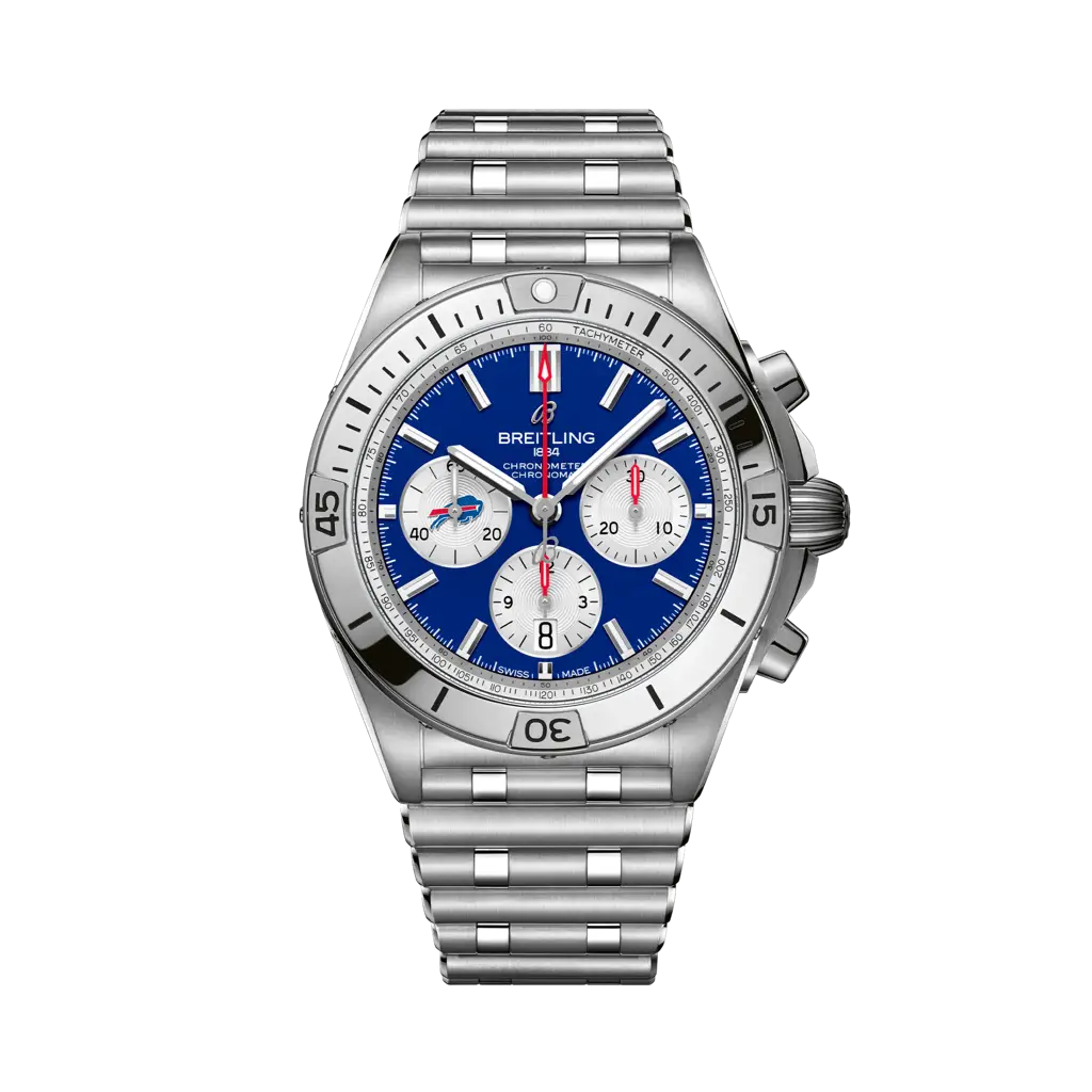 A match-up as exciting as the Super Bowl. Breitling announces a long-term exclusive licensing agreement with the National Football League (NFL), the world’s premier professional football organization consisting of 32 teams. Our Chronomat B01 42 NFL Team Editions special edition watch series captures the essence of this renowned league and is available exclusively in the U.S. No matter which of the legendary franchises you support, there’s a timepiece that represents your team. The 32 watches, limited to 104 pieces each, are powered by Breitling’s exceptional Manufacture Caliber 01. Each caseback is specially designed with the NFL’s shield and engraved with the “One of 104” limitation. The Breitling Chronomat B01 42 Buffalo Bills watch honors this iconic NFL club with team colors captured in its blue dial with white subdials. The recognizable Buffalo Bills logo appears on the subdial at 9 o’clock. Available on either a stainless-steel Rouleaux bracelet or rubber Rouleaux, this is the watch to demonstrate your loyalty to Buffalo’s home team.