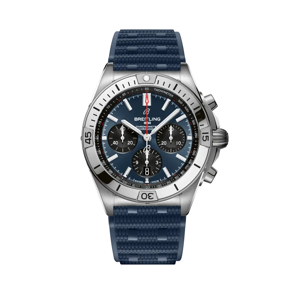 Breitling’s all-purpose watch for your every pursuit. The Chronomat holds a significant place in Breitling’s history. Introduced in 1984, at a time where extra-thin quartz timepieces were the order of the day, Breitling placed a bold bet on an impressively proportioned mechanical watch. Based on the Frecce Tricolori chronograph, which had been developed and launched in 1983 in collaboration with the famed Italian aerial squadron, the Chronomat celebrated Breitling’s centenary in style and marked the return of the mechanical chronograph to its rightfully prominent place at the brand which had built its global reputation on these incredible watches. Available in a variety of materials from stainless steel to luxurious 18 k red gold, the Chronomat features a 42 mm case and the iconic bezel with the four rider tabs. Available in a range of colorful dials, the Chronomat is matched to the signature “Rouleaux” bracelet in metal or rubber and is powered by the in-house Breitling Manufacture Caliber 01, a COSC-certified chronometer.