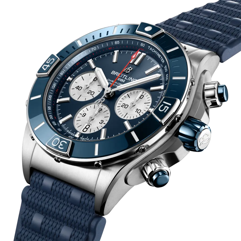Breitling’s supercharged watch for your every pursuit. The Super Chronomat is inspired by the original 1980s Chronomat that Breitling created for the hotshots of aerobatic squadrons. The boldest of all Chronomat watches, the Super Chronomat features several ceramic inserts – on the bezel, on the chronograph pushers and on the crown – as well as a Rouleaux-inspired rubber strap. Still, this all-purpose sports watch won’t get in the way of your sense of style. The Super Chronomat comes in several colour and metal variations, from stainless steel to 18 k red gold. It either features the iconic Rouleaux bracelet or a rubber Rouleaux-inspired strap, matched with a folding clasp. The Super Chronomat B01 44 is powered by the Breitling Manufacture Calibre 01, a COSC-certified chronometer.