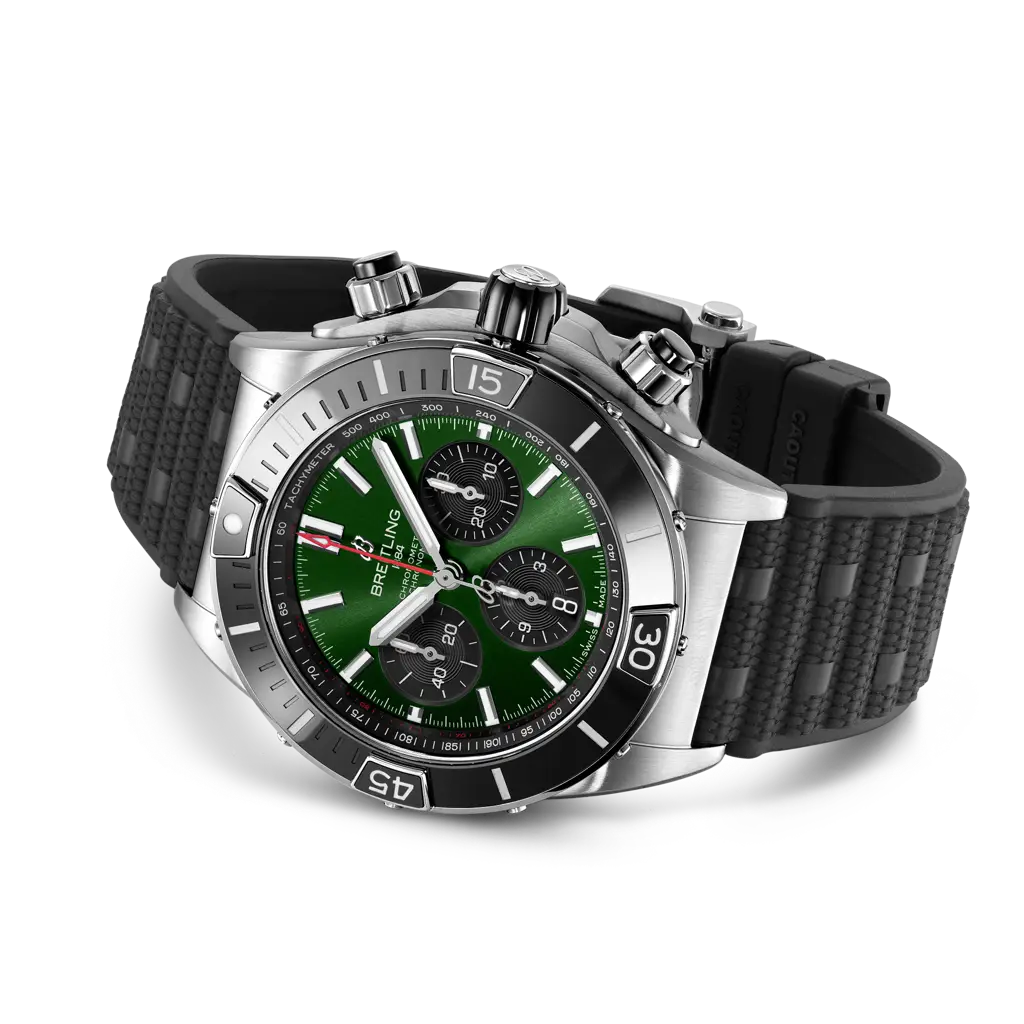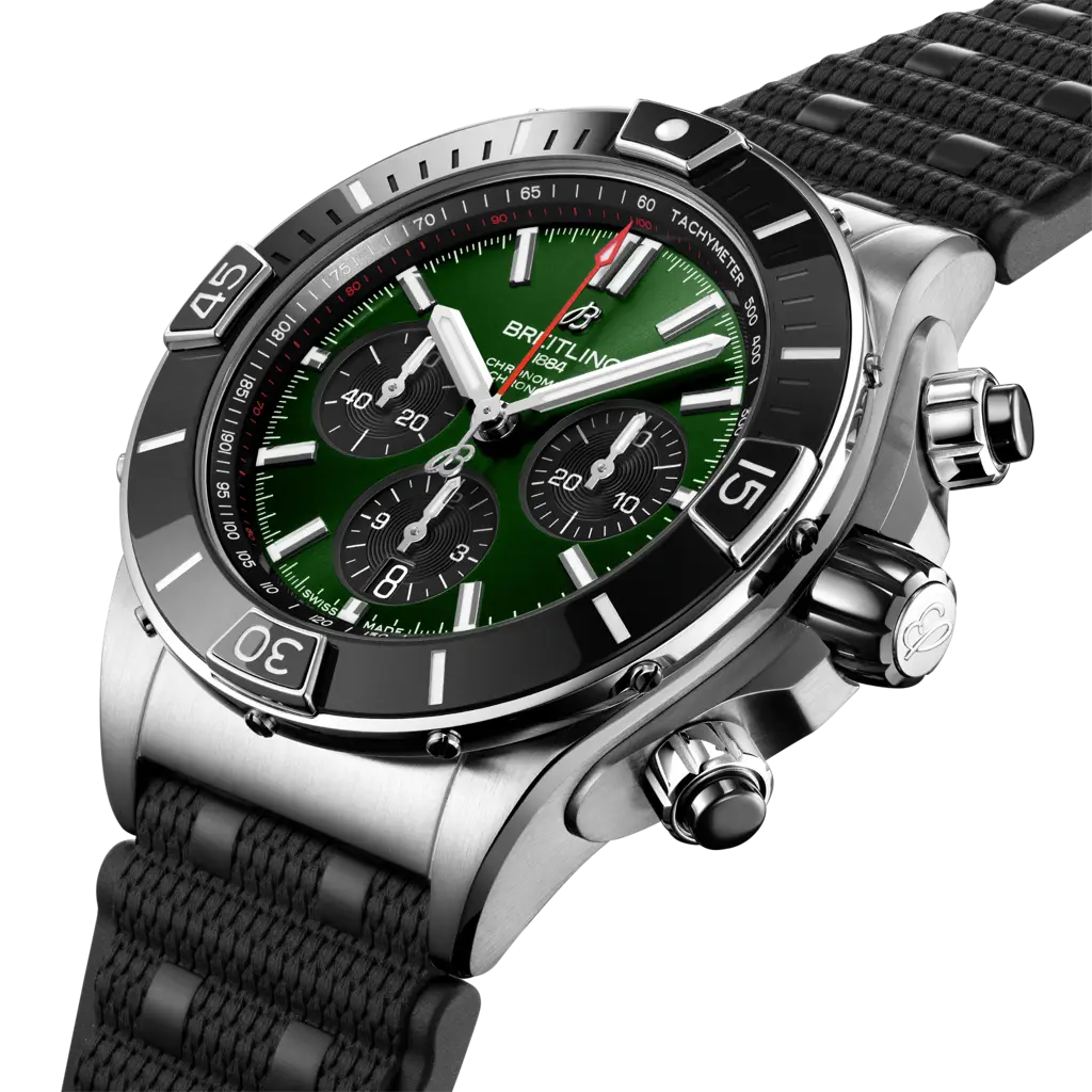 Breitling’s supercharged watch for your every pursuit. The Super Chronomat is inspired by the original 1980s Chronomat that Breitling created for the hotshots of aerobatic squadrons. The boldest of all Chronomat watches, the Super Chronomat features several ceramic inserts – on the bezel, on the chronograph pushers and on the crown – as well as a Rouleaux-inspired rubber strap. Still, this all-purpose sports watch won’t get in the way of your sense of style. The Super Chronomat comes in several colour and metal variations, from stainless steel to 18 k red gold. It either features the iconic Rouleaux bracelet or a rubber Rouleaux-inspired strap, matched with a folding clasp. The Super Chronomat B01 44 is powered by the Breitling Manufacture Calibre 01, a COSC-certified chronometer.