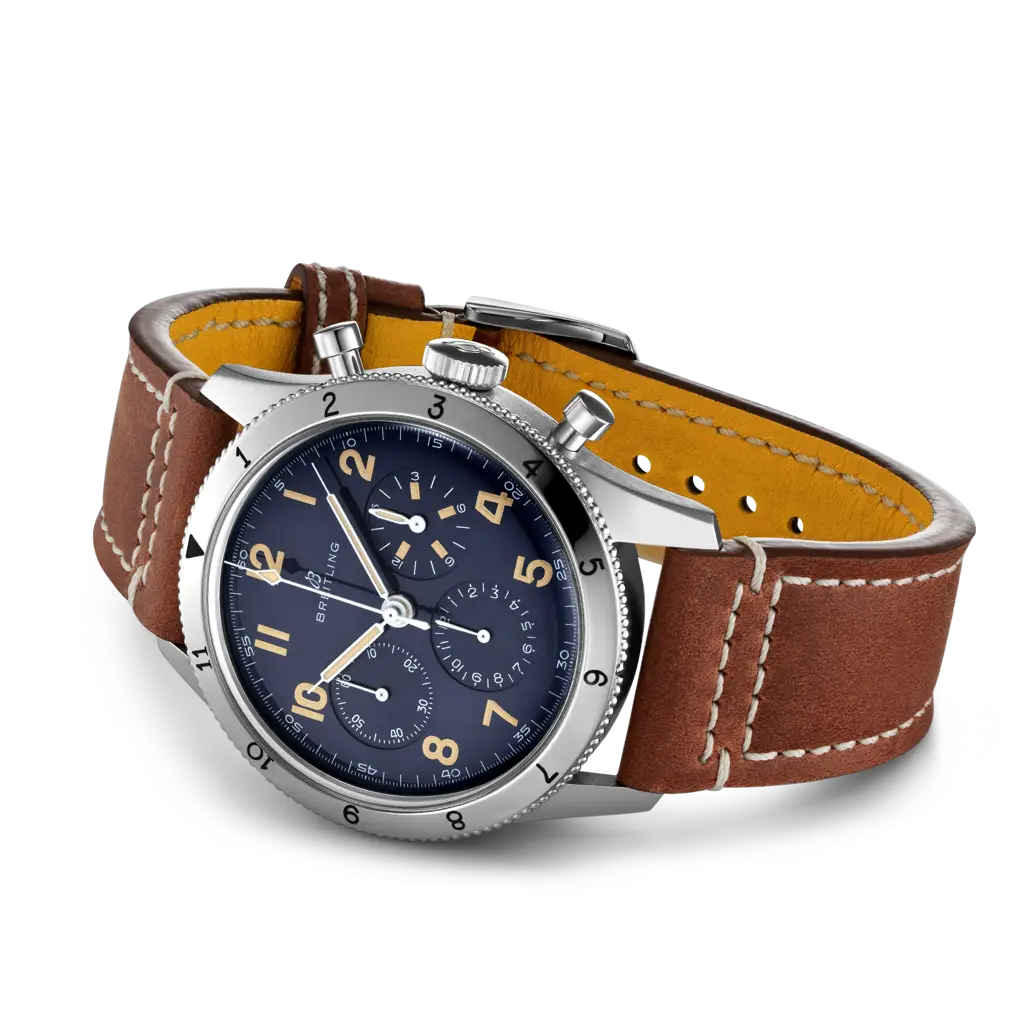 Back in the 1950s, the original Co-Pilot Ref. 765 AVI starred next to another Breitling icon: the Navitimer. With its bold design, engraved rotating bezel and extra legible dial the 765 AVI instantaneously became the perfect companion to the Navitimer as the rugged and reliable pilots’ watch. Today, the AVI 1953 Edition offers a luxury twist on the original design of the Co-Pilot Ref. 765 AVI from 1953. The all-blue dial, protected by a highly-domed Hesalite crystal, has the same Arabic numerals than the original Co-Pilot, with tone-on-tone small second, 15-minute and 12-hour chronograph counters. The hand-applied Super-LumiNova color has been carefully chosen to recall the original luminescent material and gives the AVI 1953 Edition an additional touch of vintage allure. The AVI 1953 Edition features a 41mm platinum case with a water resistance up to 3 bar (30 meters). The AVI 1953 Edition is powered by the in-house Breitling Manufacture Caliber B09, a hand-wound COSC-certified caliber based on the renowned Breitling Caliber 01. It is available on a gold vintage-inspired leather strap with an 18k white gold pin buckle as a limited-edition of 153 pieces, each of which is engraved “ONE OF 153”.