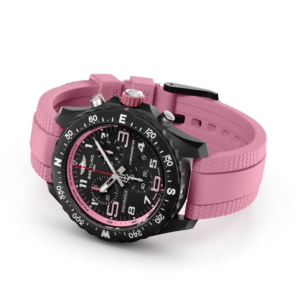 Designed to be both a lightweight timepiece for athletes and a casual, everyday sports chronograph, the Endurance Pro perfectly blends innovative technology with a vibrant design to produce the ultimate athleisure watch. Designed for men and women whose active lives combine a professional mindset with a sporty lifestyle, the Endurance Pro is up to the challenges of a rigorous workout, but fashionable enough for everyday wear. The Endurance Pro features an ultra-light Breitlight® case, a robust material 3.3 times lighter than titanium and 5.8 times lighter than stainless steel. Non-magnetic, thermally stable and hypoallergenic, Breitlight® is highly resistant to scratches, traction and corrosion. It also has a feel that is warmer than metal and a slightly textured effect, accentuating the originality of the design. Exclusive to Breitling, the material is 100-percent Swiss-made. In 44 mm or 38 mm, the Endurance Pro is available to athletes with a multitude of colorful dials and rubber straps all fitting a Breitlight® tang-type buckle. The two sizes are respectively powered by Breitling’s Caliber 82 and 83, both COSC-certified SuperQuartz™ chronographs delivering exceptional precision.