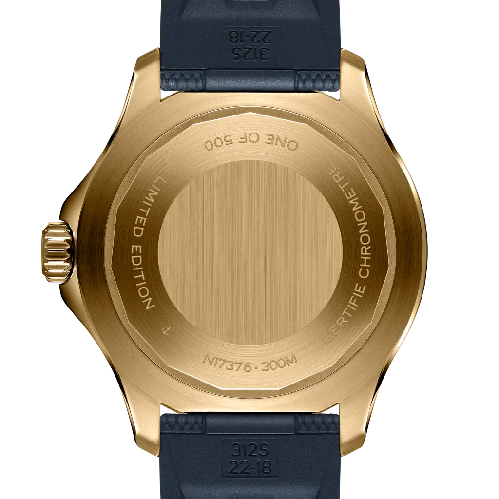 Performance and style for all your water-based pursuits. In the 1960s, the new sport of scuba diving was all the rage. For divers, timing was everything, and Breitling set out to give them the most clear-cut dive watch possible by eliminating any feature that didn’t support their lifesaving needs underwater. This pared-down watch was named the Slow Motion. What remained were clean lines, chunky luminescent indexes, squared-off hands and a high-contrast dial ring, all aimed at maximum legibility. Practical, yes. But what people really fell in love with was the look. The new Superocean retraces the Slow Motion's celebrated design codes, while adding modern features, like a ceramic-inlayed bezel and brightly colored dials. Broad hands and indexes in luminescent Super-LumiNova® allow for easy readability underwater. The watch is water resistant to 300 m (1000 ft), as well as being shock-, sand- and saltwater-resistant. The bronze version uses a special alloy that has excellent resistance to corrosion, yet will still develop a subtle patina over time that makes the watch even more unique. The two strap options (rubber and metal bracelet) have a folding clasp that allows for micro-adjustments of up to 15 mm for easy wear over rashies and wetsuits. Its scratch-proof ceramic inlayed bezel will never wear or fade. For safety, the bezel is uni-directional on most sizes and bi-directional with a patented lock on the 46 mm. Best of all, this is no longer strictly a dive watch—surf with it, swim with it, hit the beach bar with it, then wear it out to dinner. The Superocean perfectly balances the nostalgia of its heritage with a fresh new look.