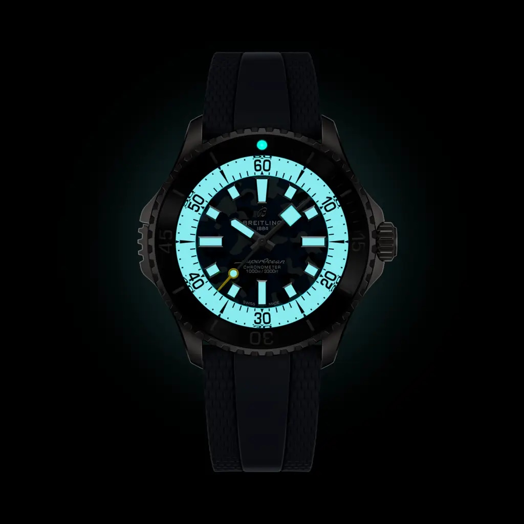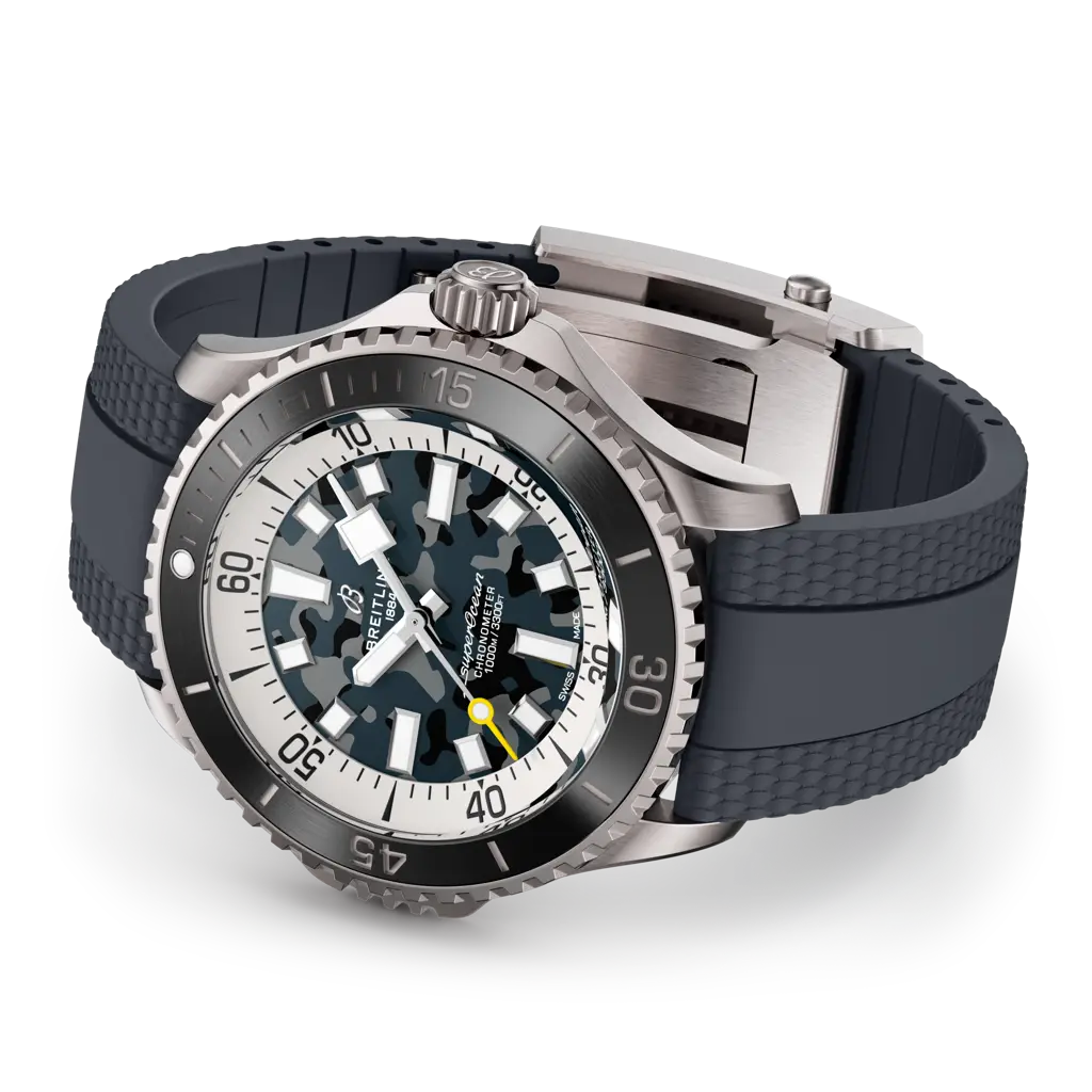 Super performance for all your water-based pursuits. In the 1960s, the new sport of scuba diving was all the rage. For divers, timing was everything, and Breitling set out to give them the most clear-cut dive watch possible by eliminating any feature that didn’t support their lifesaving needs underwater. This pared-down watch was named the Superocean Slow Motion. What remained were clean lines, chunky luminescent indexes, squared-off hands and a high-contrast dial ring, all aimed at maximum legibility. Practical, yes. But what people really fell in love with was the look. The Superocean Automatic 46 Super Diver retraces the Slow Motion's celebrated design codes, while adding modern features, like a scratch-proof matt ceramic-inlayed bezel and camouflage dials. Broad hands and indexes in luminescent Super-LumiNova® allow for easy readability underwater. The watch is water resistant to 1,000 m (3,300 ft), as well as being shock-, sand- and saltwater-resistant. And there’s much more to this watch than meets the eye: Its soft-iron inner case offers protection against the effects of magnetic fields, while its bi-directional rotating bezel can be safely secured with a lock on the left side of the case. The two strap options (rubber or titanium bracelet) have a folding clasp that allows for micro-adjustments of up to 15 mm for easy wear over rashies and wetsuits. Best of all, this is no longer strictly a dive watch—surf with it, swim with it, hit the beach bar with it, then wear it out to dinner. The Superocean perfectly balances the nostalgia of its heritage with a fresh new look.