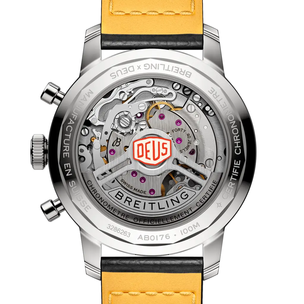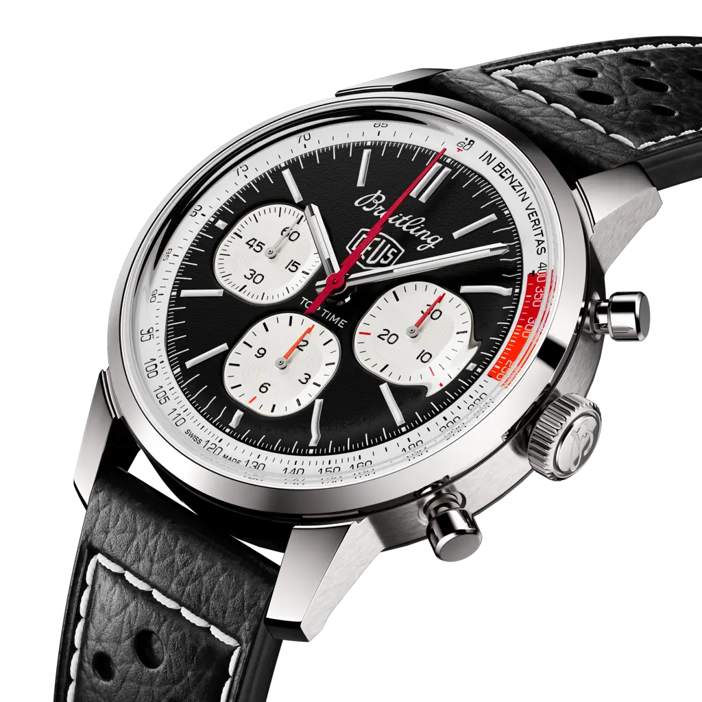 The 1960s was a decade of experimentation, fun, freedom and energy. Whether cruising on a motorcycle or revving up a sportscar, living life at full speed was the order of the day. Willy Breitling felt this change of pace and set out to design an unconventional chronograph that would capture the verve of era. He called it the Top Time. That spirited tradition continues today with Breitling partnering with some of the coolest names in wheels to create its Top Time designs. Co-designed with Australian surf-and-motorcycle outfitter Deus Ex Machina, the Top Time B01 Deus will appeal to bikers, boarders and backpackers, all looking for the freedom to explore the world their own way, at their own pace. It features the Deus emblem and adage “In benzin veritas” on the dial as well a perforated leather racing strap, speed-measuring tachymeter scale and contrasting “squircle” (not quite square, not quite round) subdials that give the feel of a vintage dashboard gauge. It also comes with a special lightning-bolt-shaped chronograph hand and, under the hood, a brag-worthy engine: the exceptional Breitling Manufacture Caliber 01.