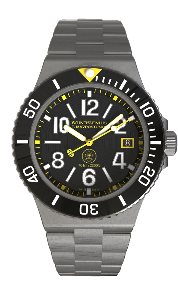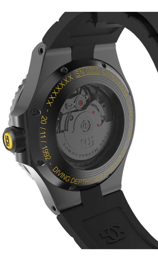 A Timepiece Honoring Theo Mavrostomos in two color variations. To celebrate this unparalleled feat of human endurance and courage. In November 1992, French diver Theo Mavrostomos etched his name into history by achieving the deepest dive ever on dry land, inside a hyperbaric chamber. Mavrostomos endured conditions equivalent to an extraordinary depth of 701 meters (2,299 ft) beneath the ocean’s surface. This watch embodies the same values that defined his achievement: strength, precision, and resilience under pressure.