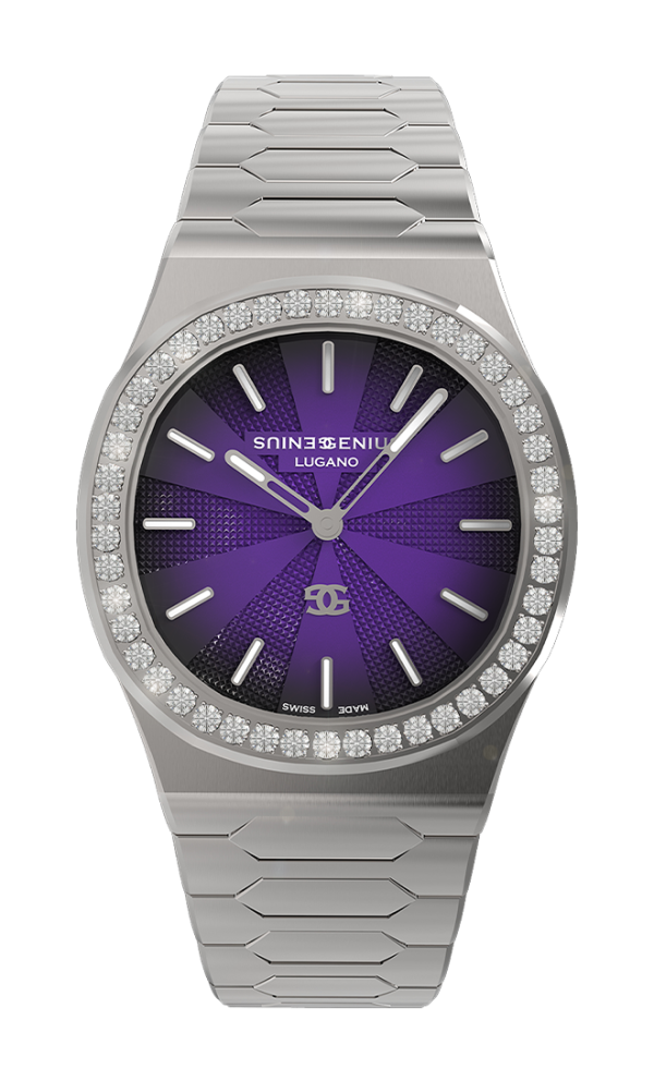 A captivating timepiece adorned with Lab Diamonds around the bezel, featuring a striking violet-to-black gradient dial that commands attention with its bold elegance and allure.