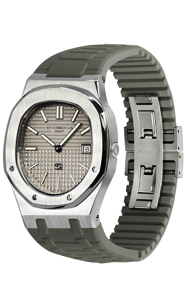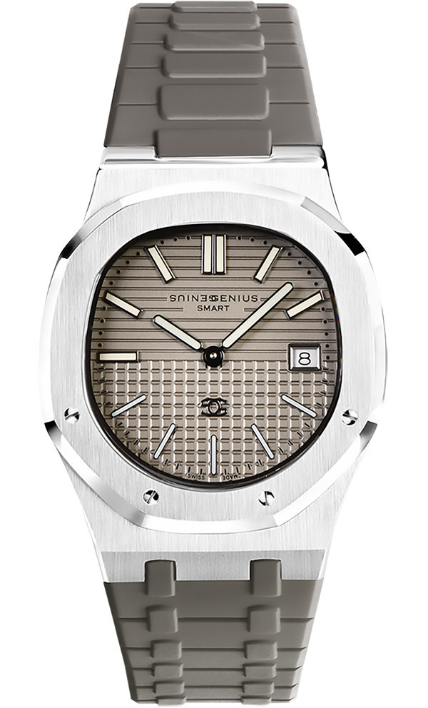 A warm taupe dial and cool grey strap—minimalist, structured, and quietly confident.