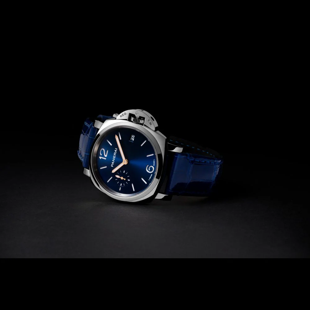 - Blue sun-brushed with luminous Arabic numerals and hour markers