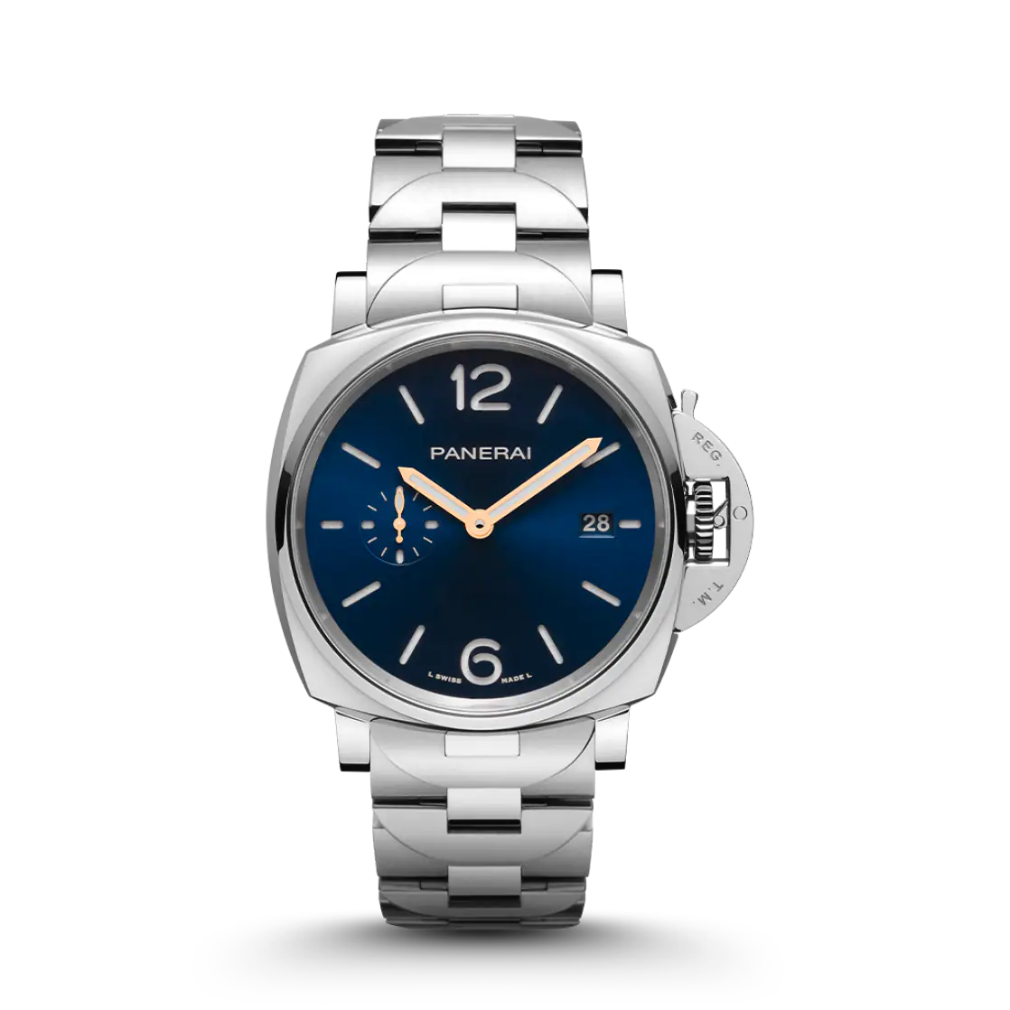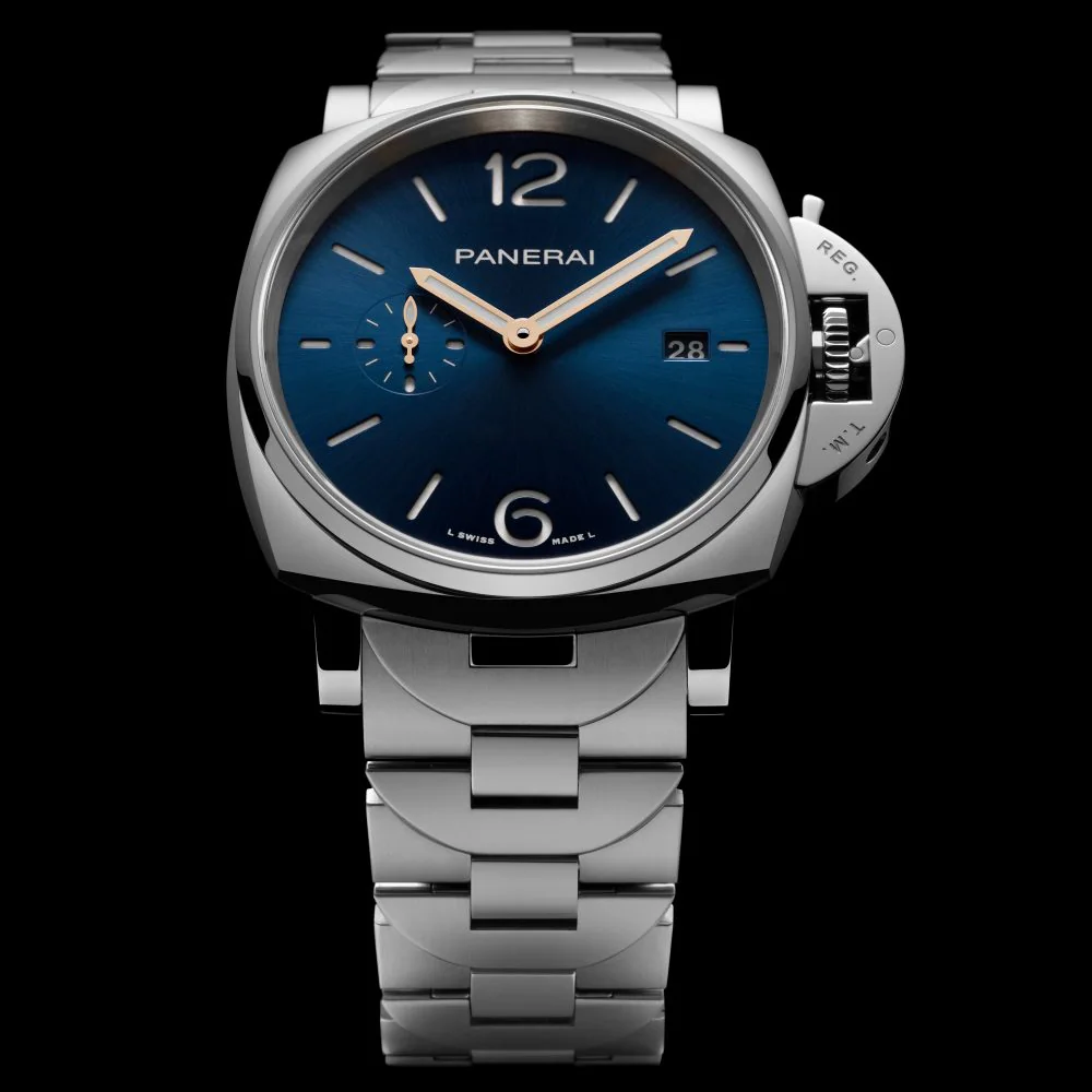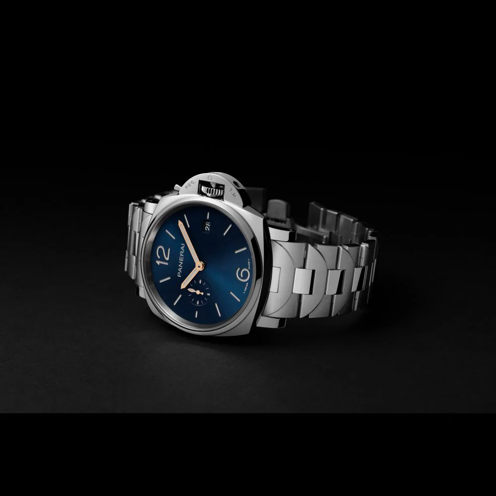 - Blue sun-brushed with luminous Arabic numerals and hour markers