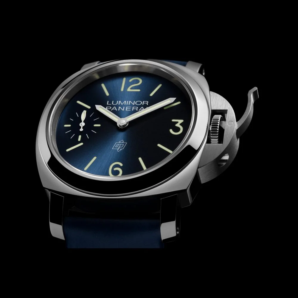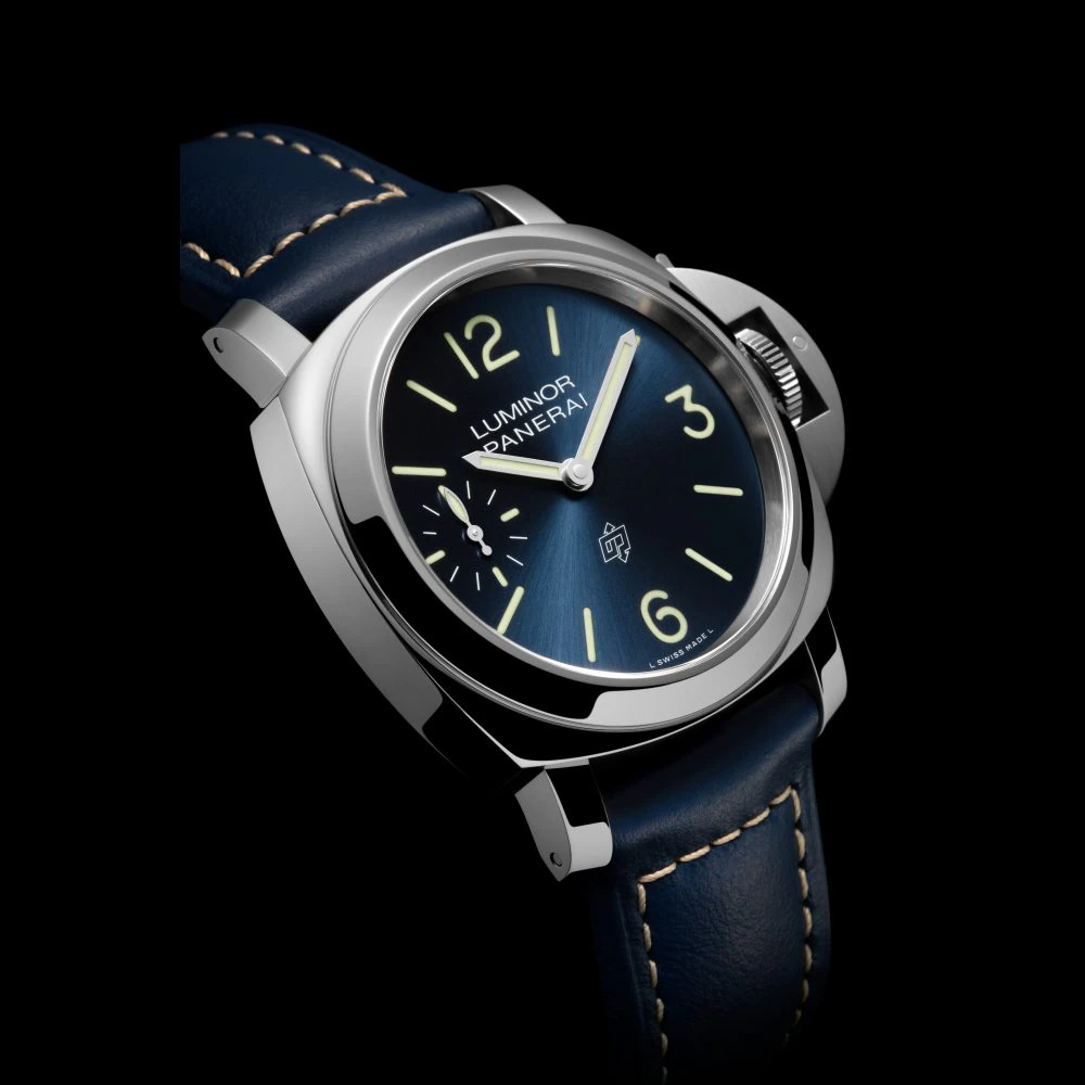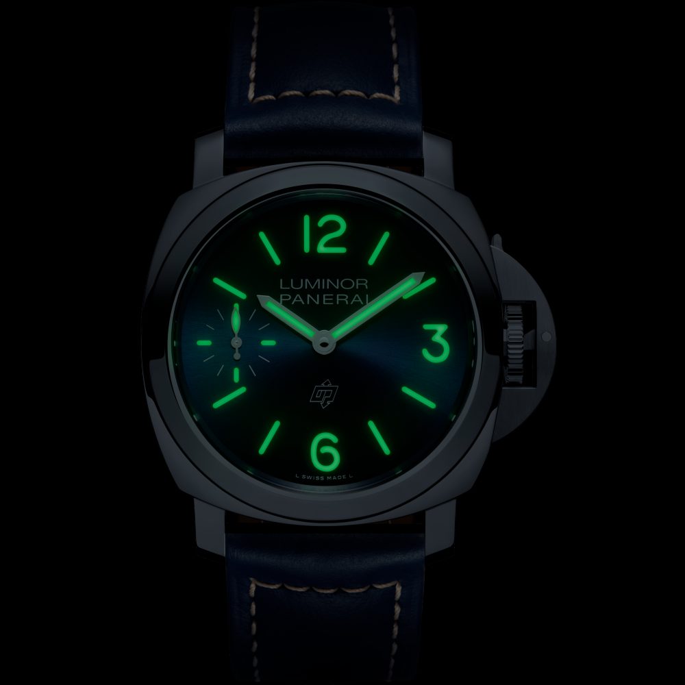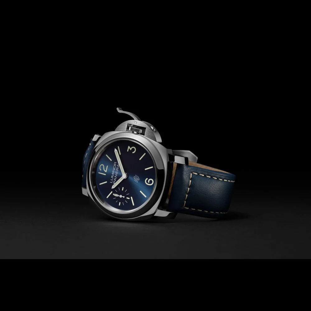 - Blue sun-brushed with luminous Arabic numerals and hour markers