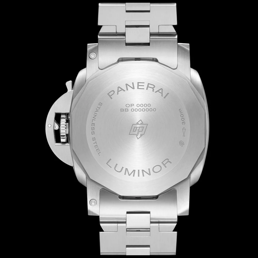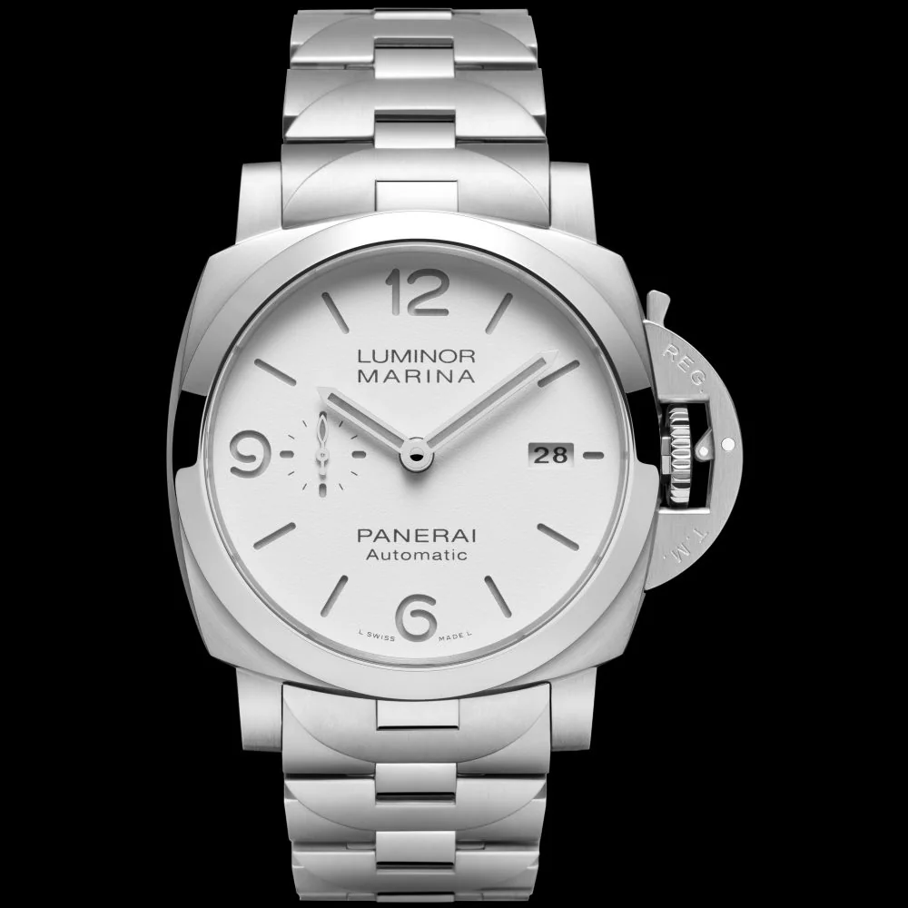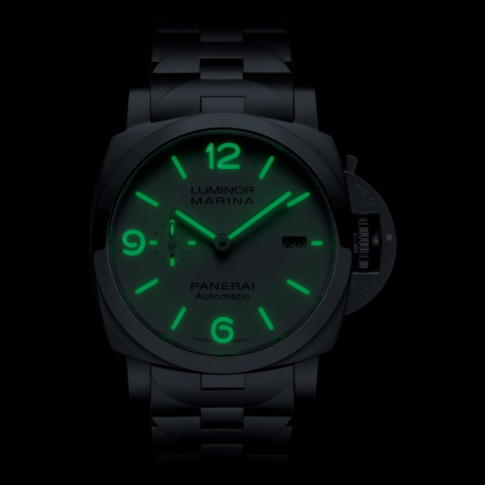 - White with luminous Arabic numerals and hour markers Date at 3 o'clock and small seconds at 9 o'clock