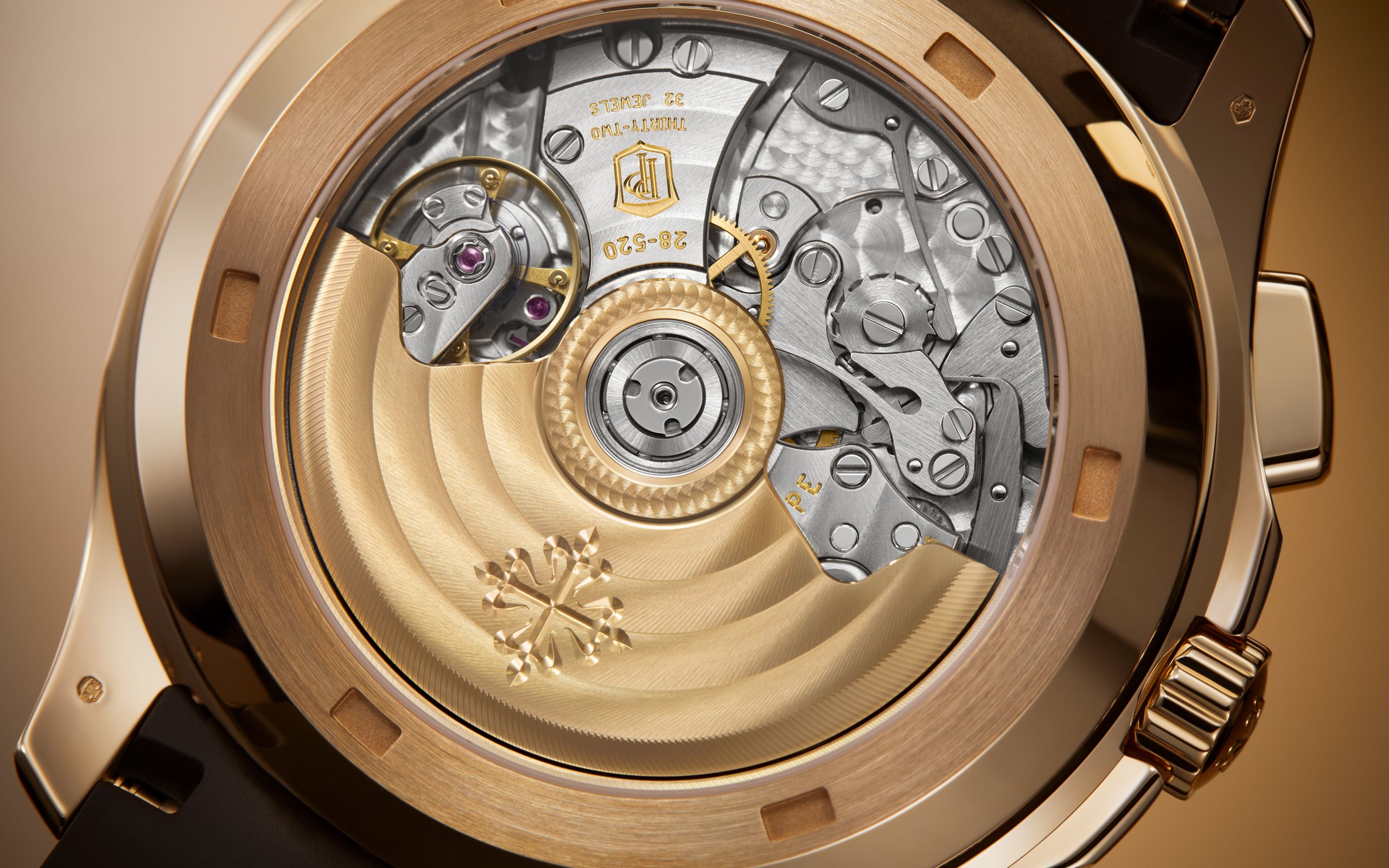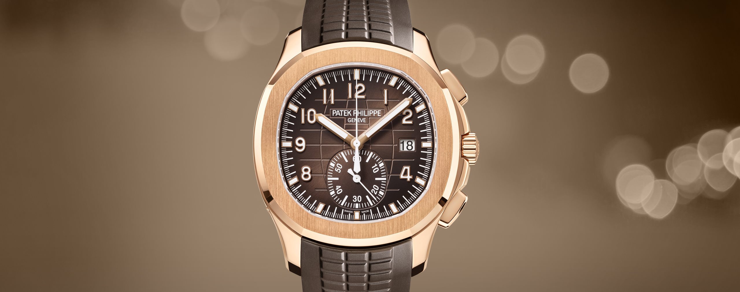 Patek Philippe revisits the sporty style of the Aquanaut chronograph in a rose gold version, paired with a sunburst brown dial featuring a black-gradient rim and matching composite strap.