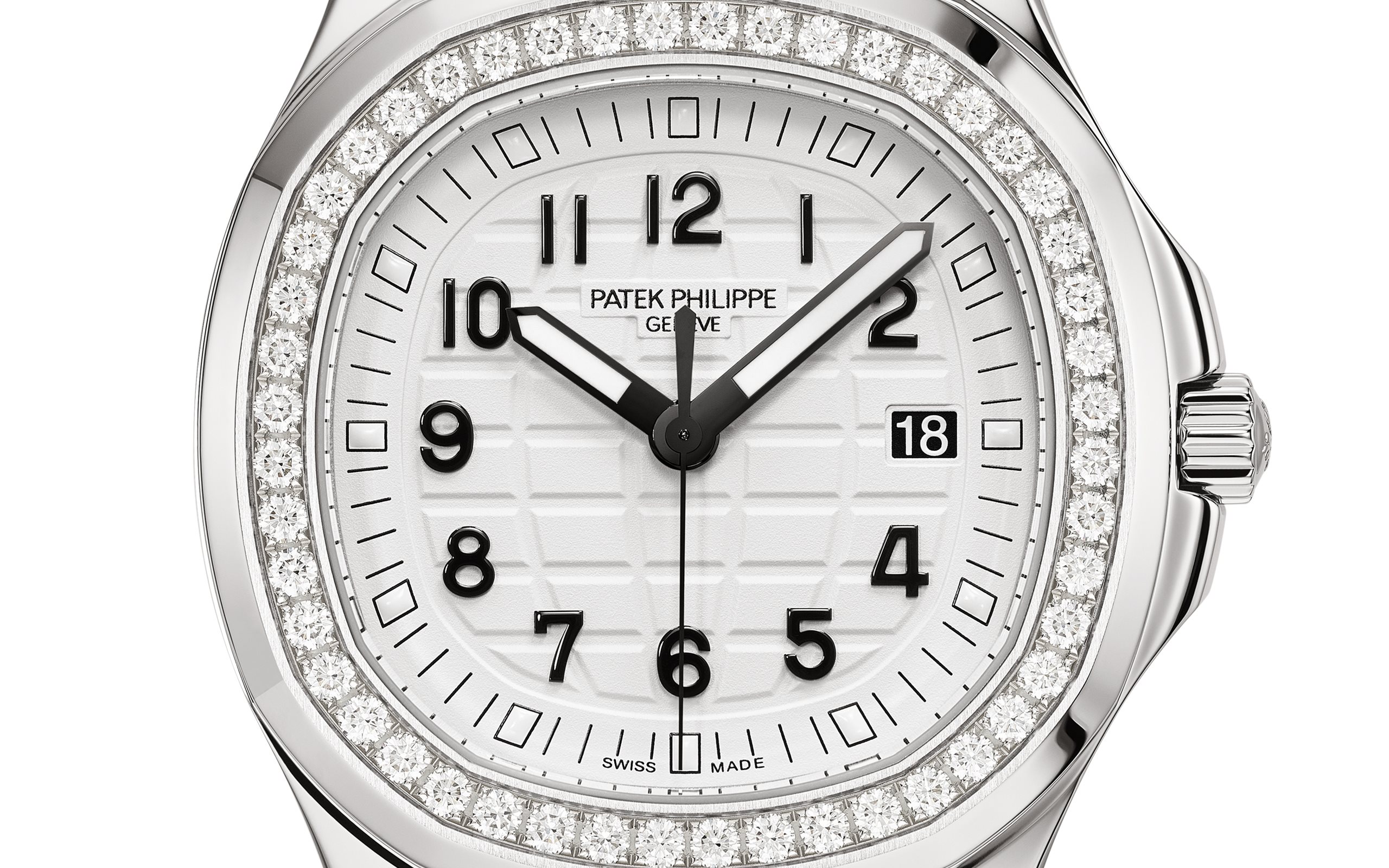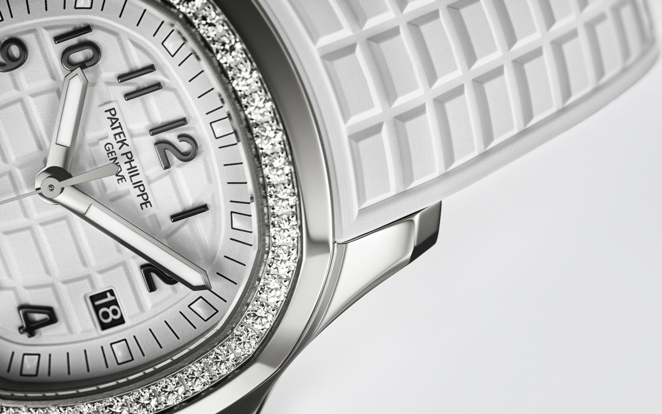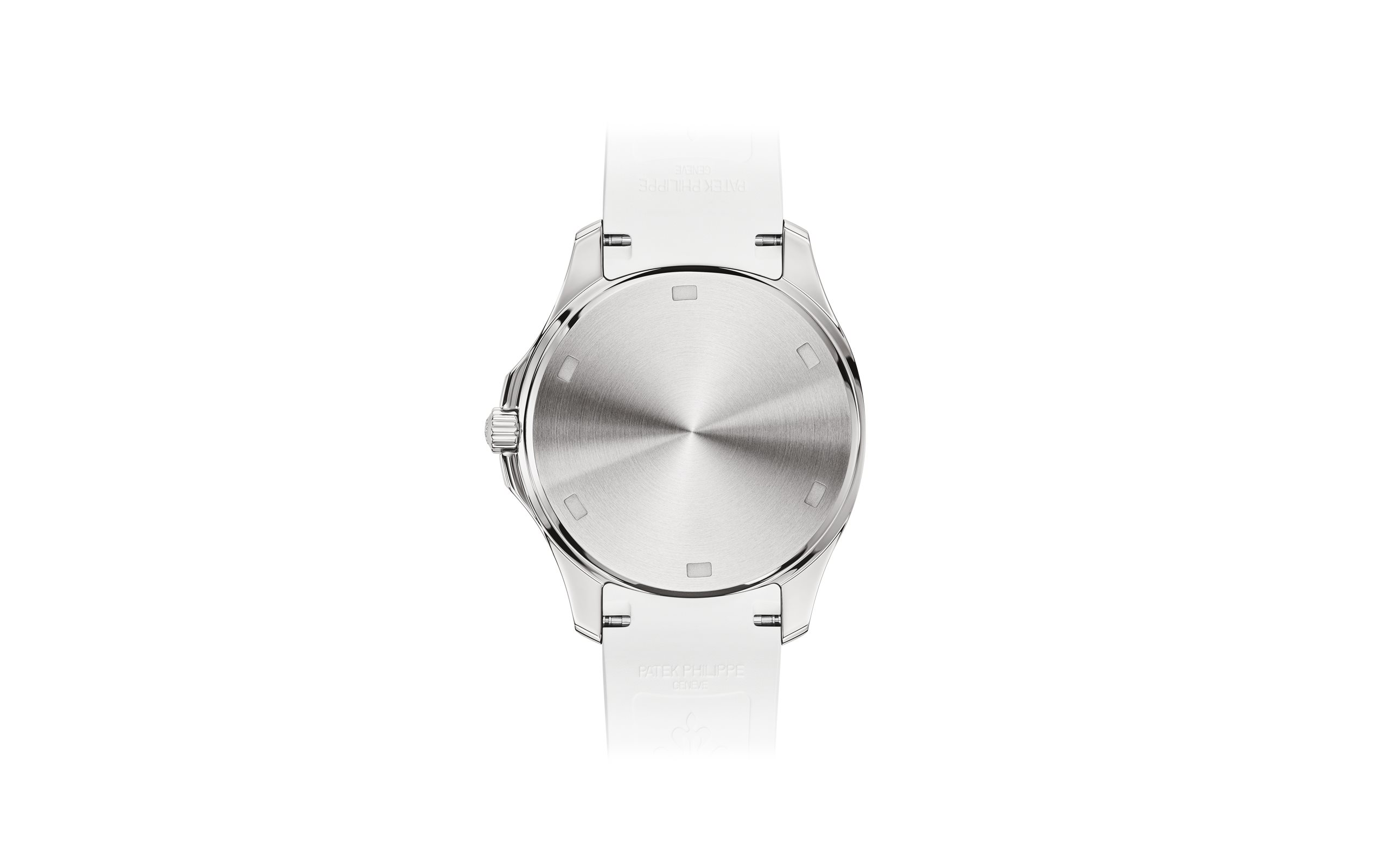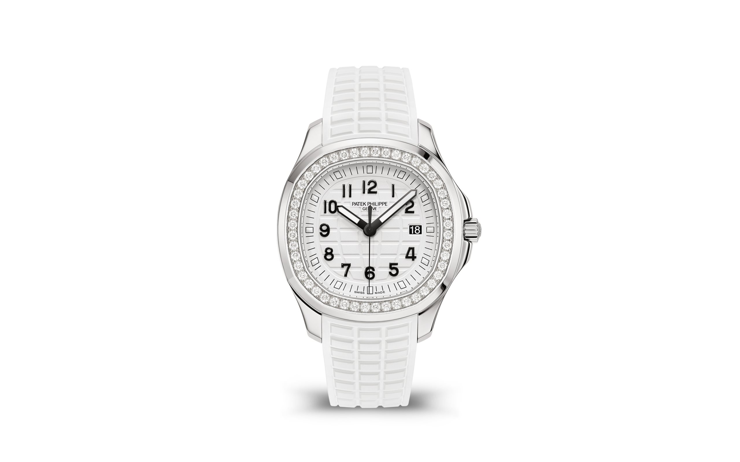 Patek Philippe reinterprets the quartz Aquanaut Luce in stainless steel with a larger diameter (38.8 mm) and a new integrated composite strap. This epitome of contemporary casual chic is attired in an elegant matte white color adorning the dial and matching strap. Water-resistant to 30m, the rounded octagonal case is enhanced by polished and satin finishes. The bezel is lit up by a row of 48 diamonds (~1.11 ct). The patented folding clasp is secured by four independent catches.