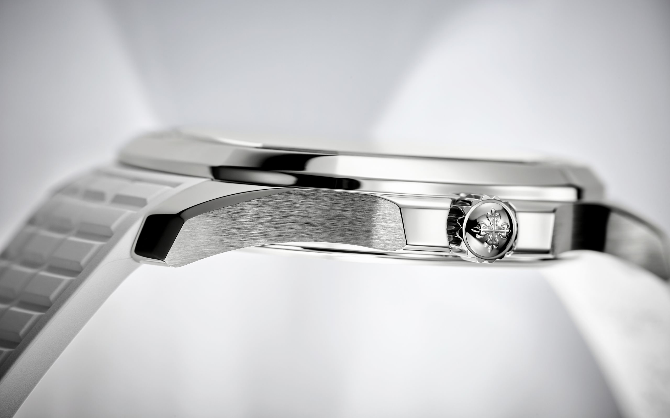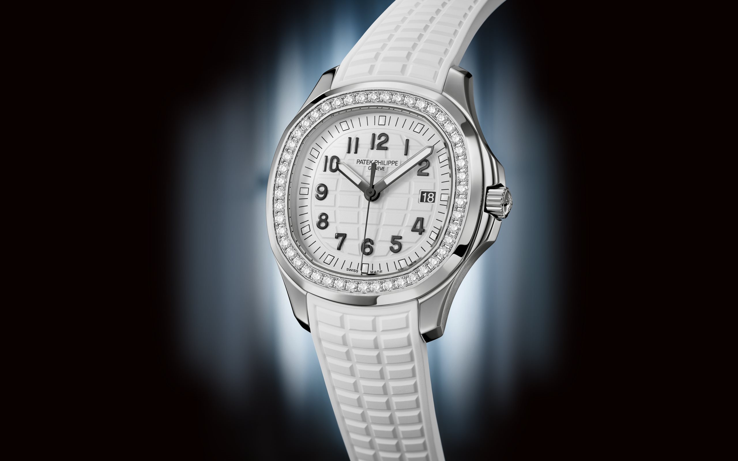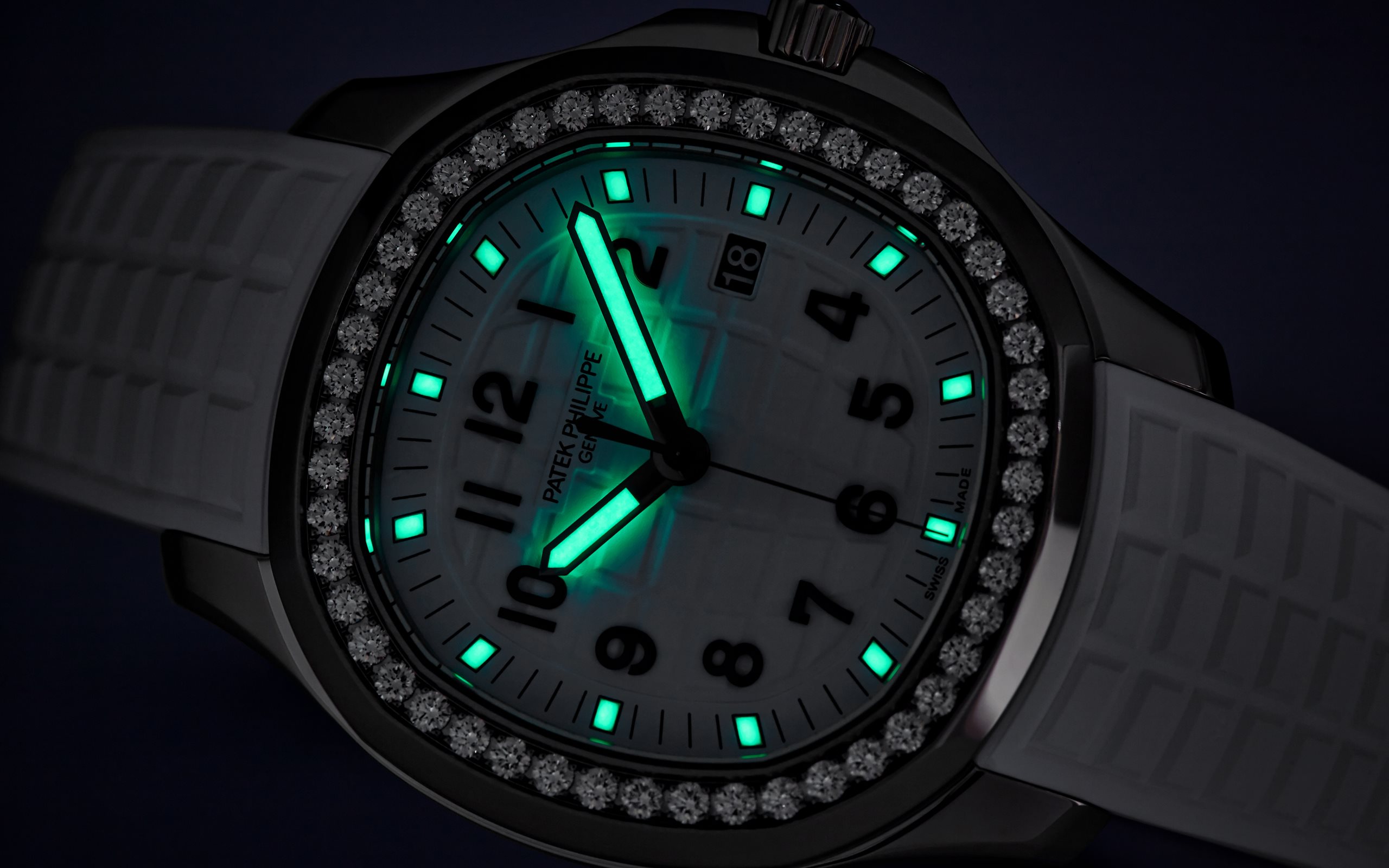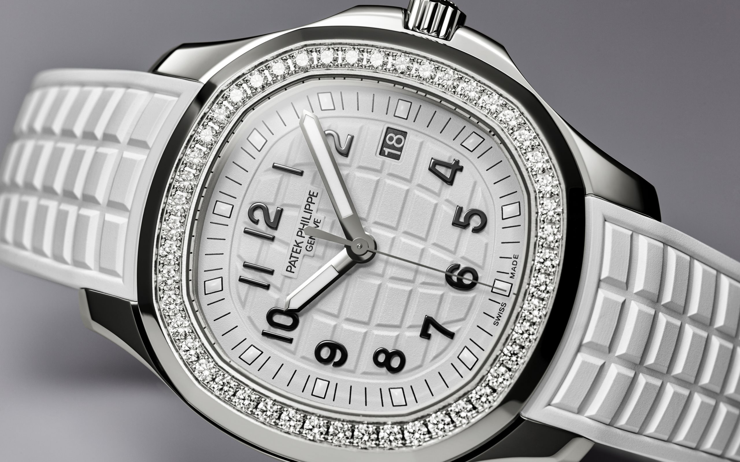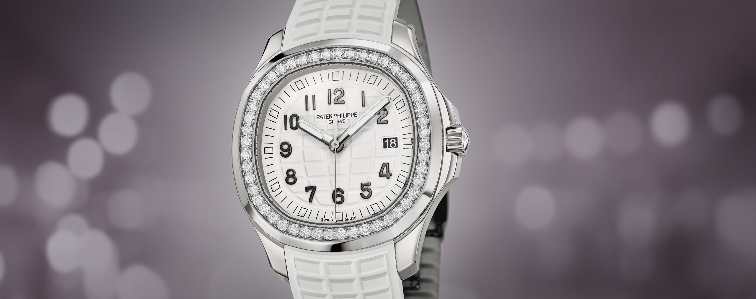 Patek Philippe reinterprets the quartz Aquanaut Luce in stainless steel with a larger diameter (38.8 mm) and a new integrated composite strap. This epitome of contemporary casual chic is attired in an elegant matte white color adorning the dial and matching strap. Water-resistant to 30m, the rounded octagonal case is enhanced by polished and satin finishes. The bezel is lit up by a row of 48 diamonds (~1.11 ct). The patented folding clasp is secured by four independent catches.