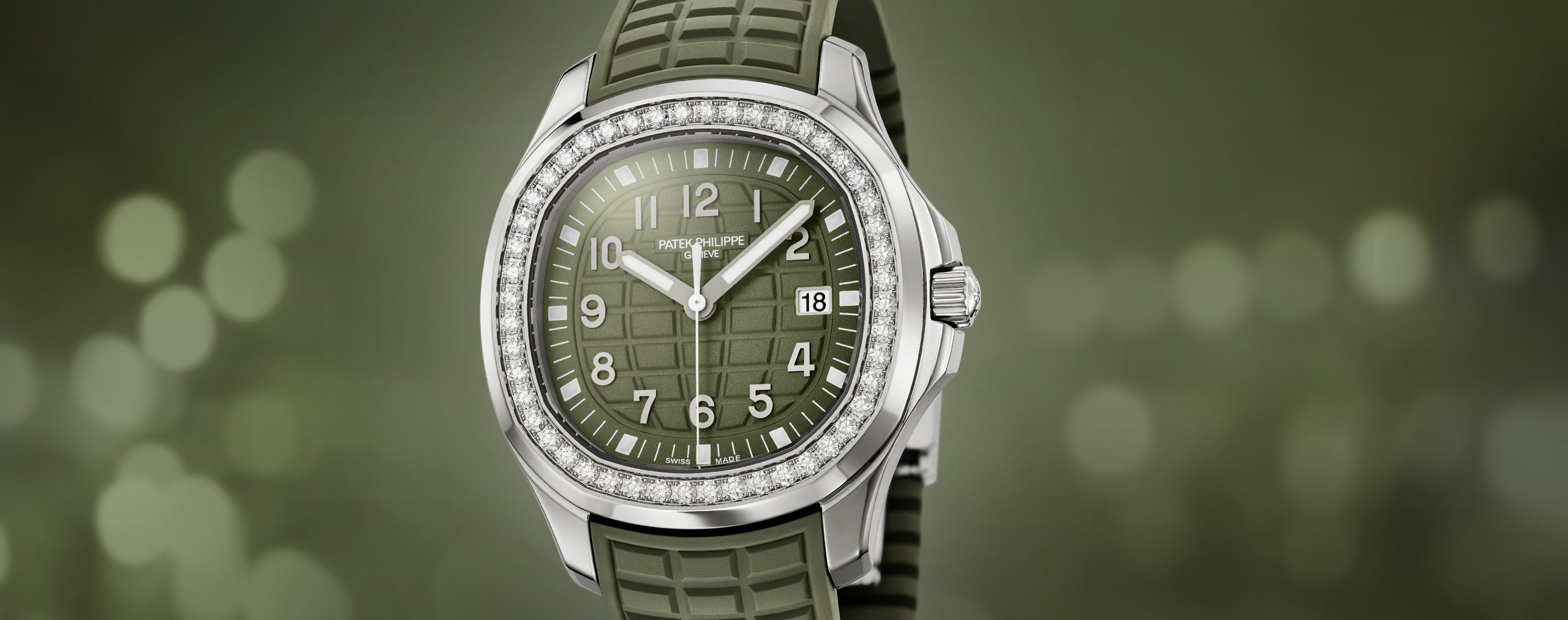 Patek Philippe reinterprets the quartz Aquanaut Luce in stainless steel with a larger diameter (38.8 mm) and a new integrated composite strap. This epitome of contemporary casual chic is attired in a bold khaki-green color adorning the dial and matching strap. Water-resistant to 30m, the rounded octagonal case is enhanced by polished and satin finishes. The bezel is lit up by a row of 48 diamonds (~1.11 ct). The patented folding clasp is secured by four independent catches.