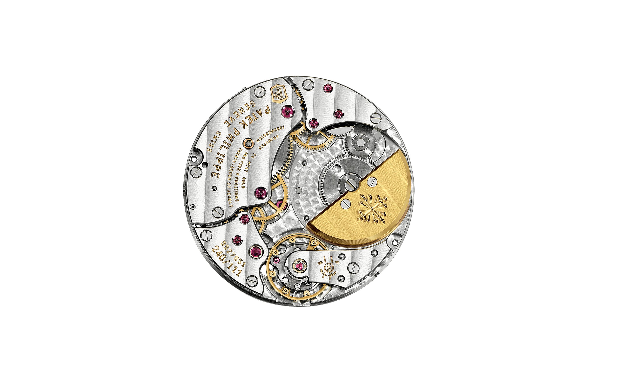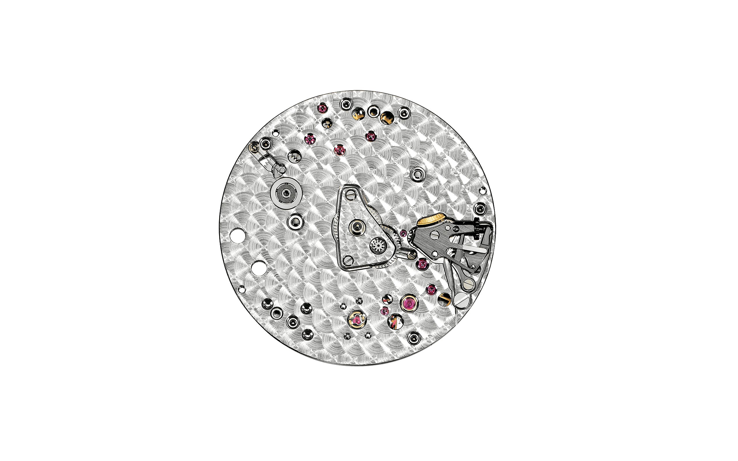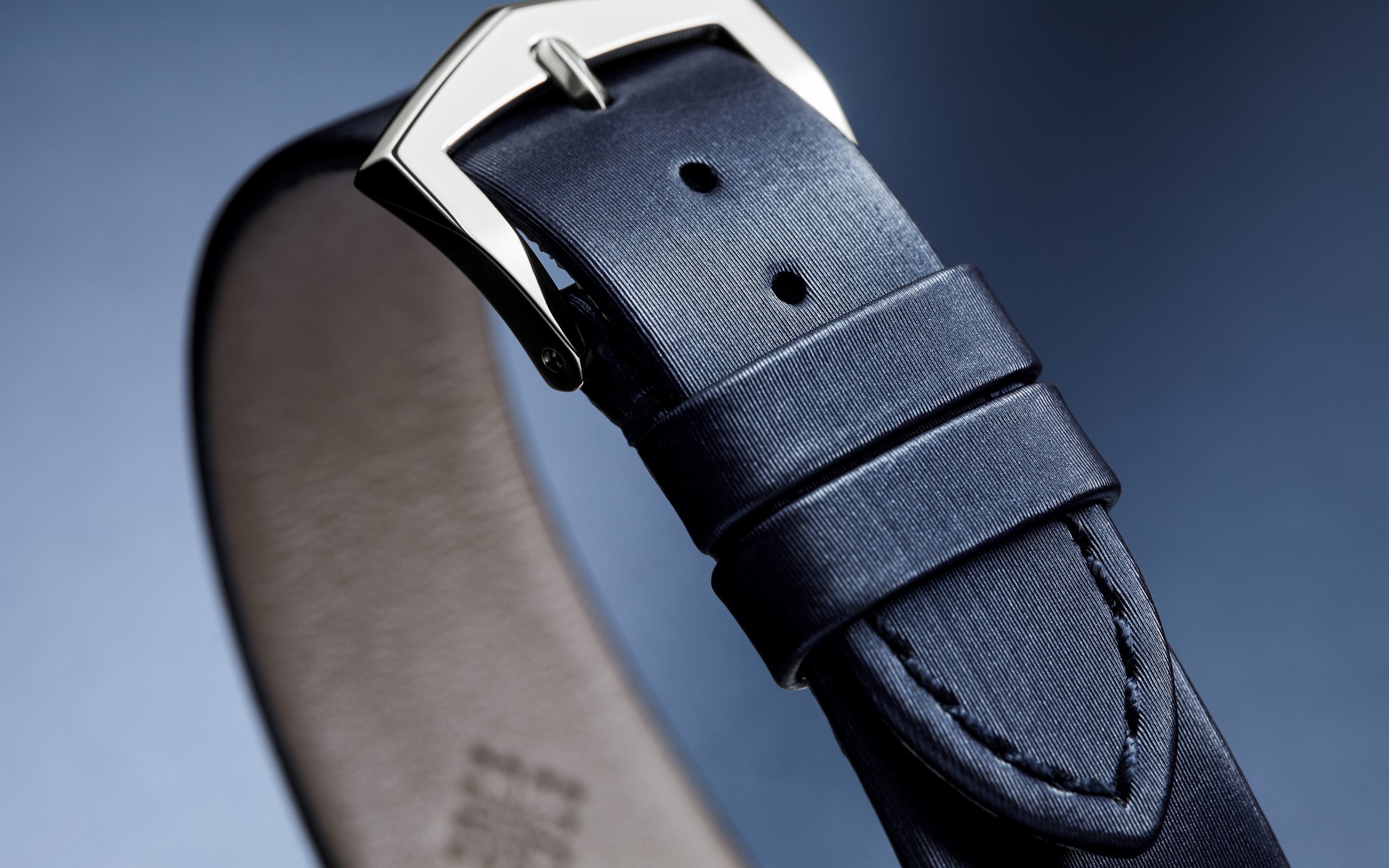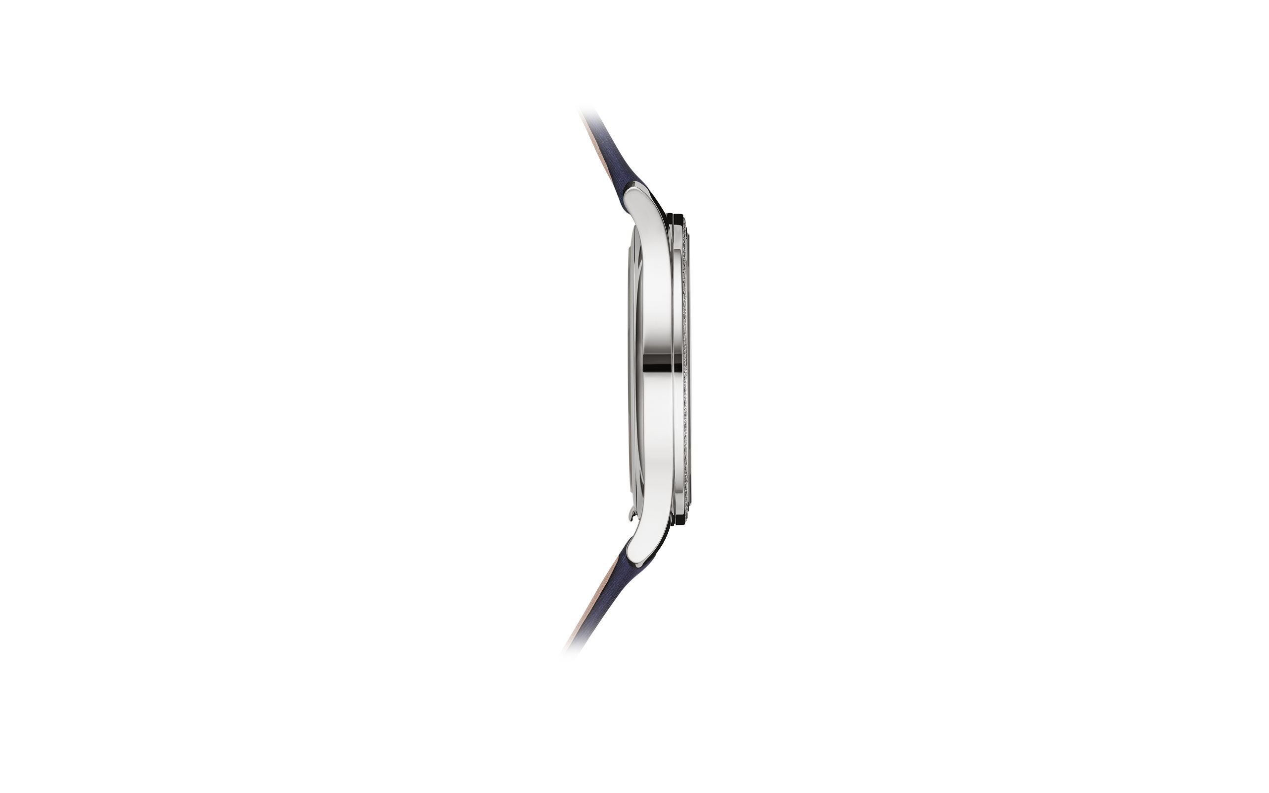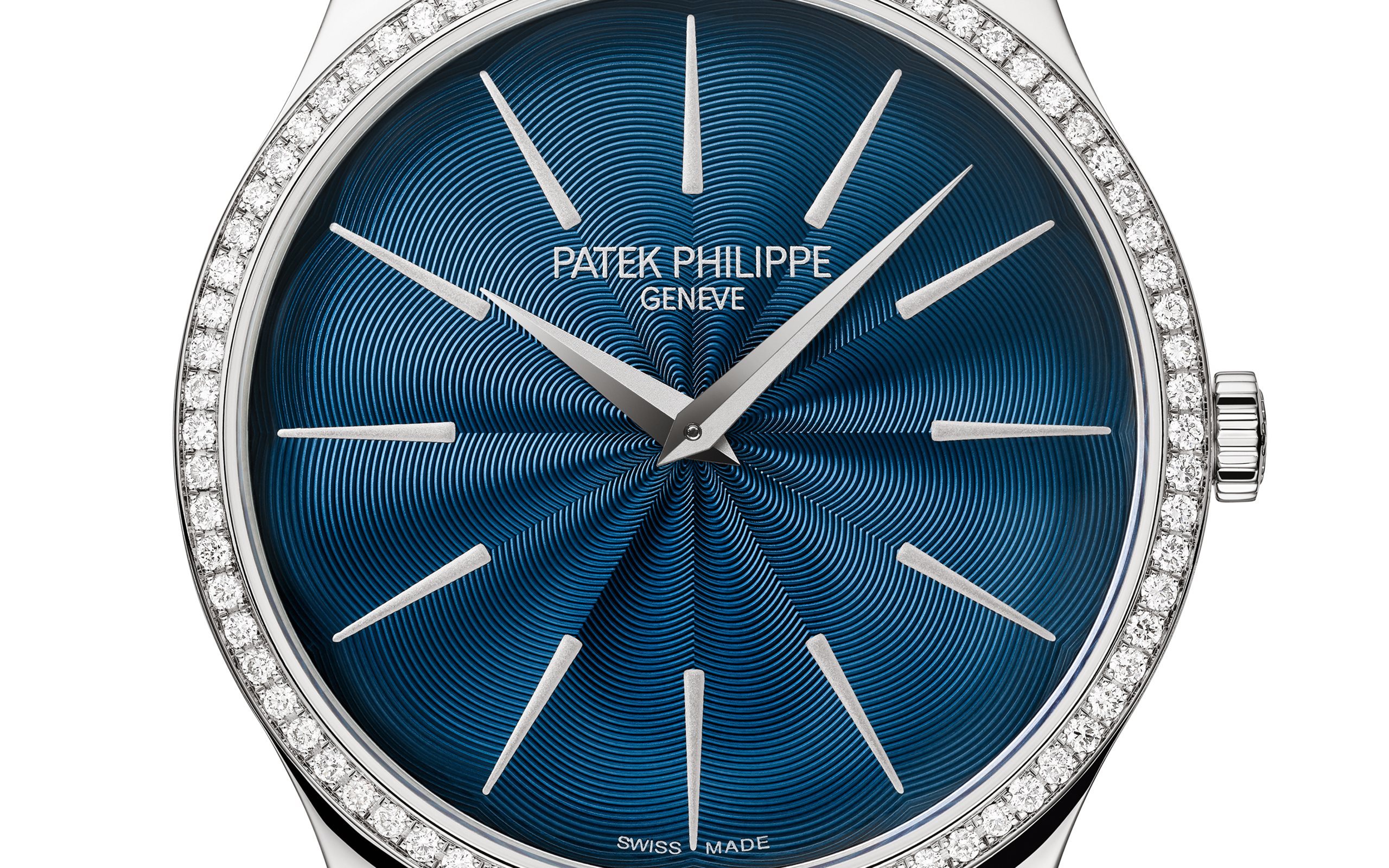 The Ladies' Calatrava with its guilloched lacquered dial features a slightly larger diameter (35mm) and a self-winding movement replacing the previous manually wound caliber. Finely adorned with concentric waves, the dial plate is coated with several successive layers of transparent midnight blue lacquer creating a subtle depth effect. The bezel is lit up by 76 round-cut internally flawless Top Wesselton diamonds. This new model comes with a brushed calfskin strap featuring a satinated finish in a color matching that of the dial.