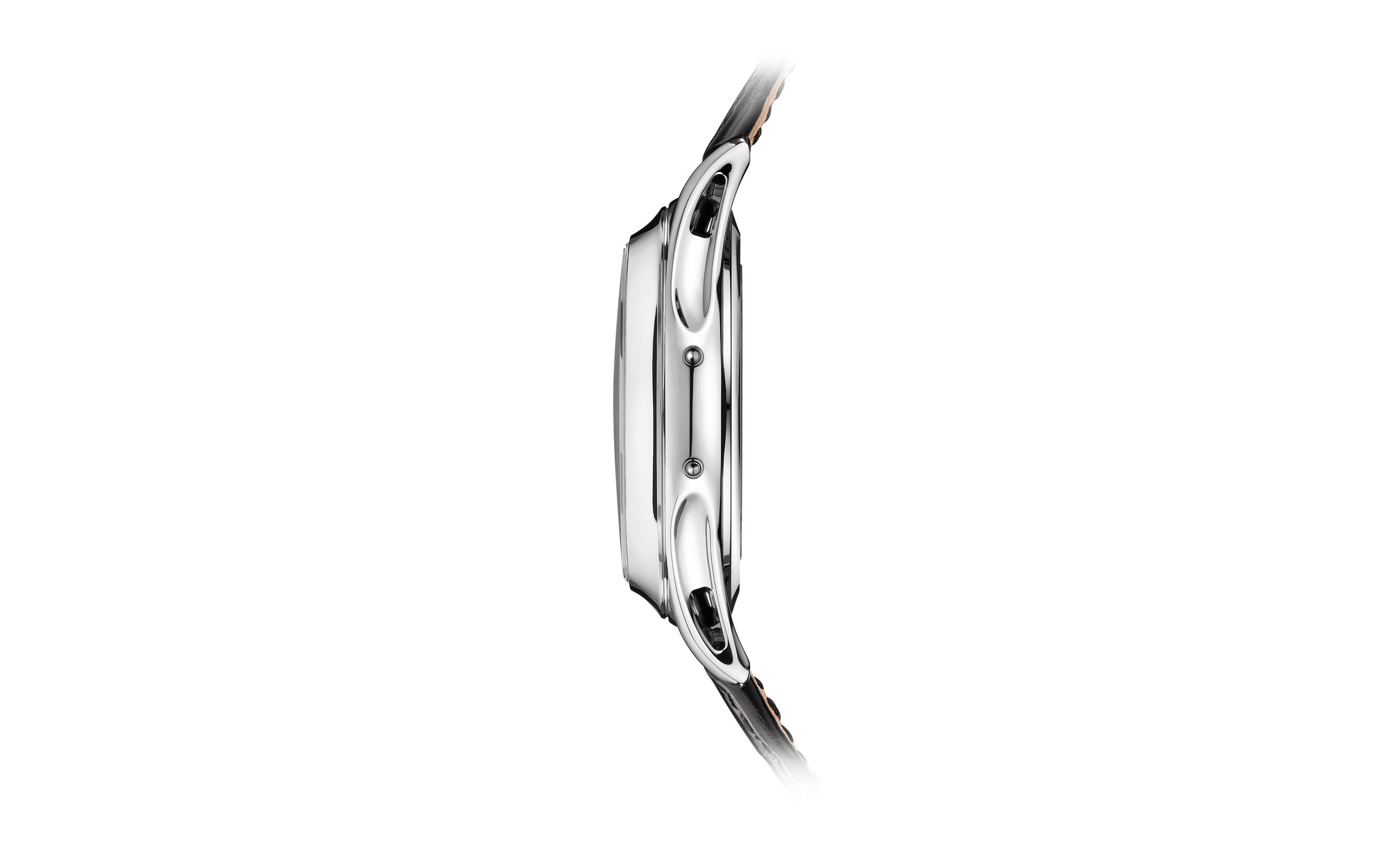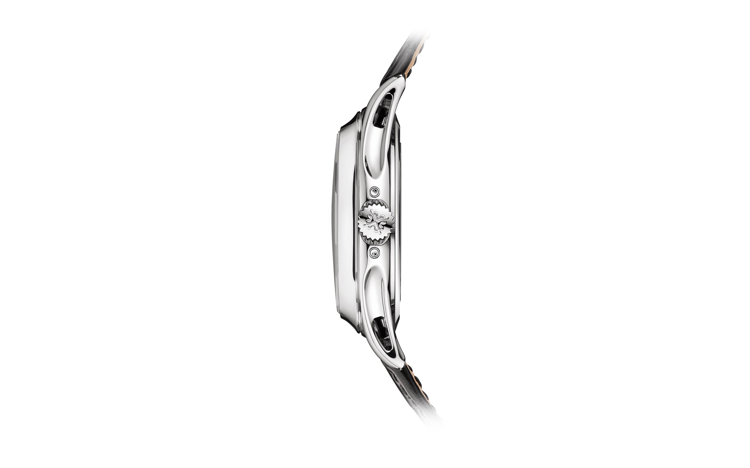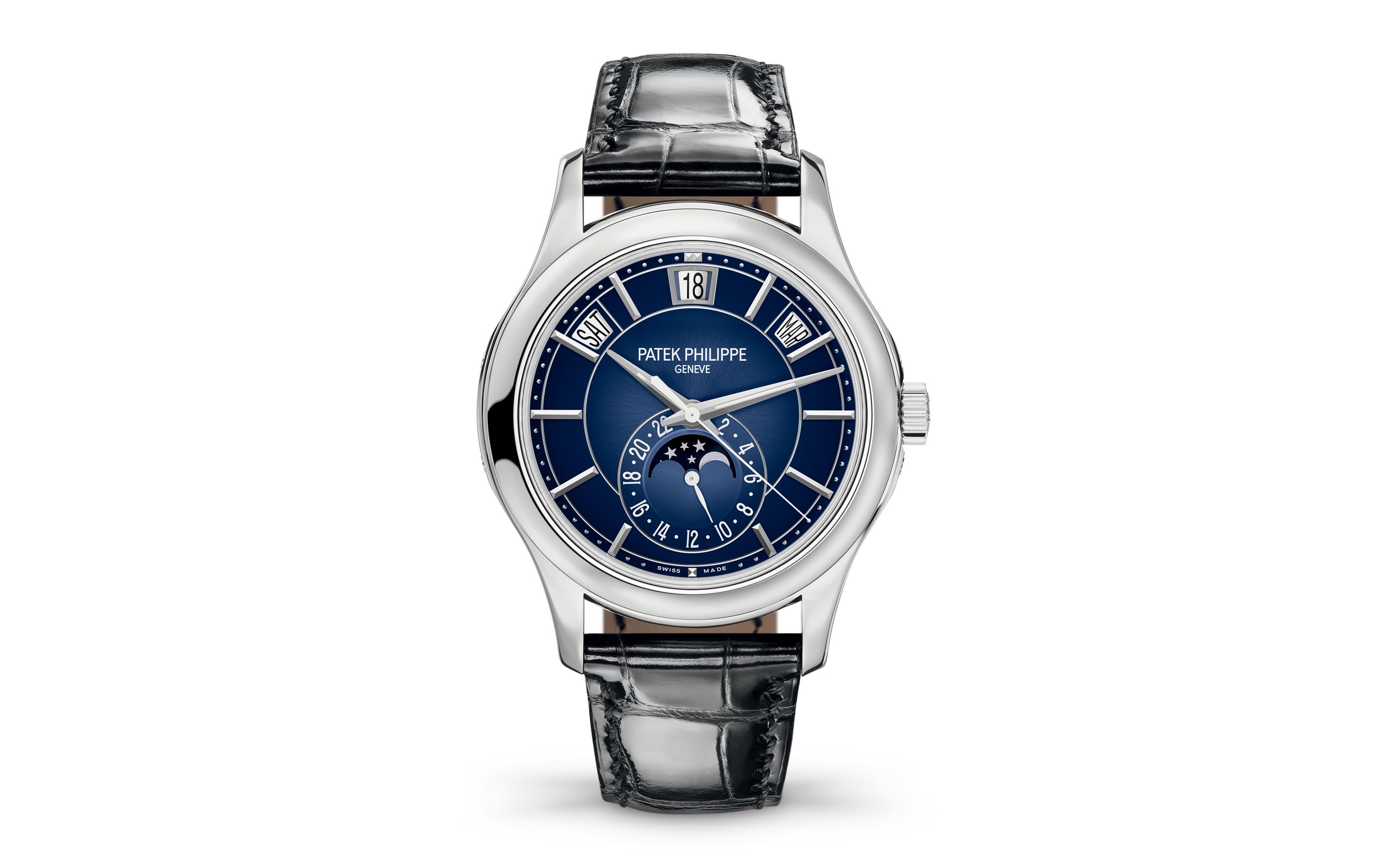 Recognizable by its three apertures along an arc for displaying the day, the date and the month, the Reference 5205 Annual Calendar pairs its white-gold version with an elegant sunburst dial in two tones of blue shading to black. The case construction is notable for the slightly concave bezel and the delicately pierced strap lugs. A sleek, dynamic and very contemporary style graces this calendar watch requiring adjustment only once a year.