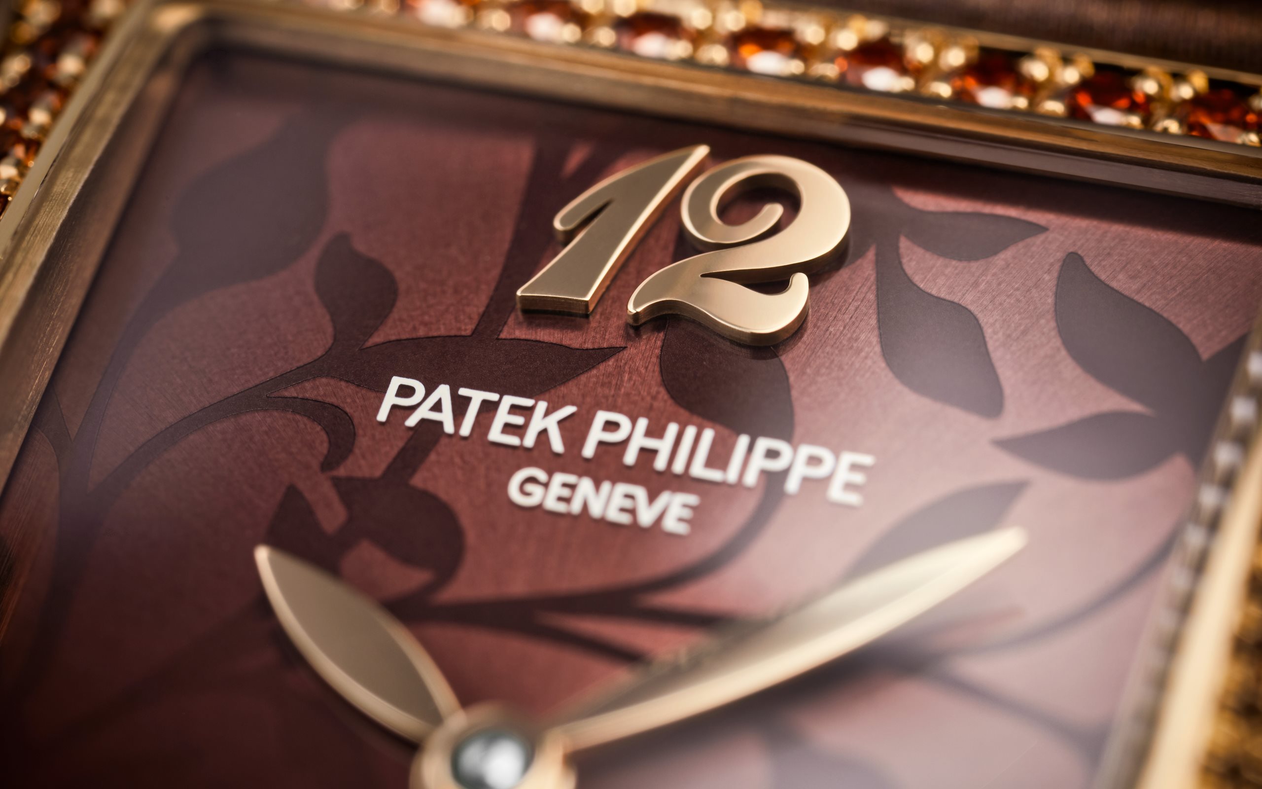 - Brown lacquered with matte and shiny finishes, floral motif, gold applied Breguet numerals