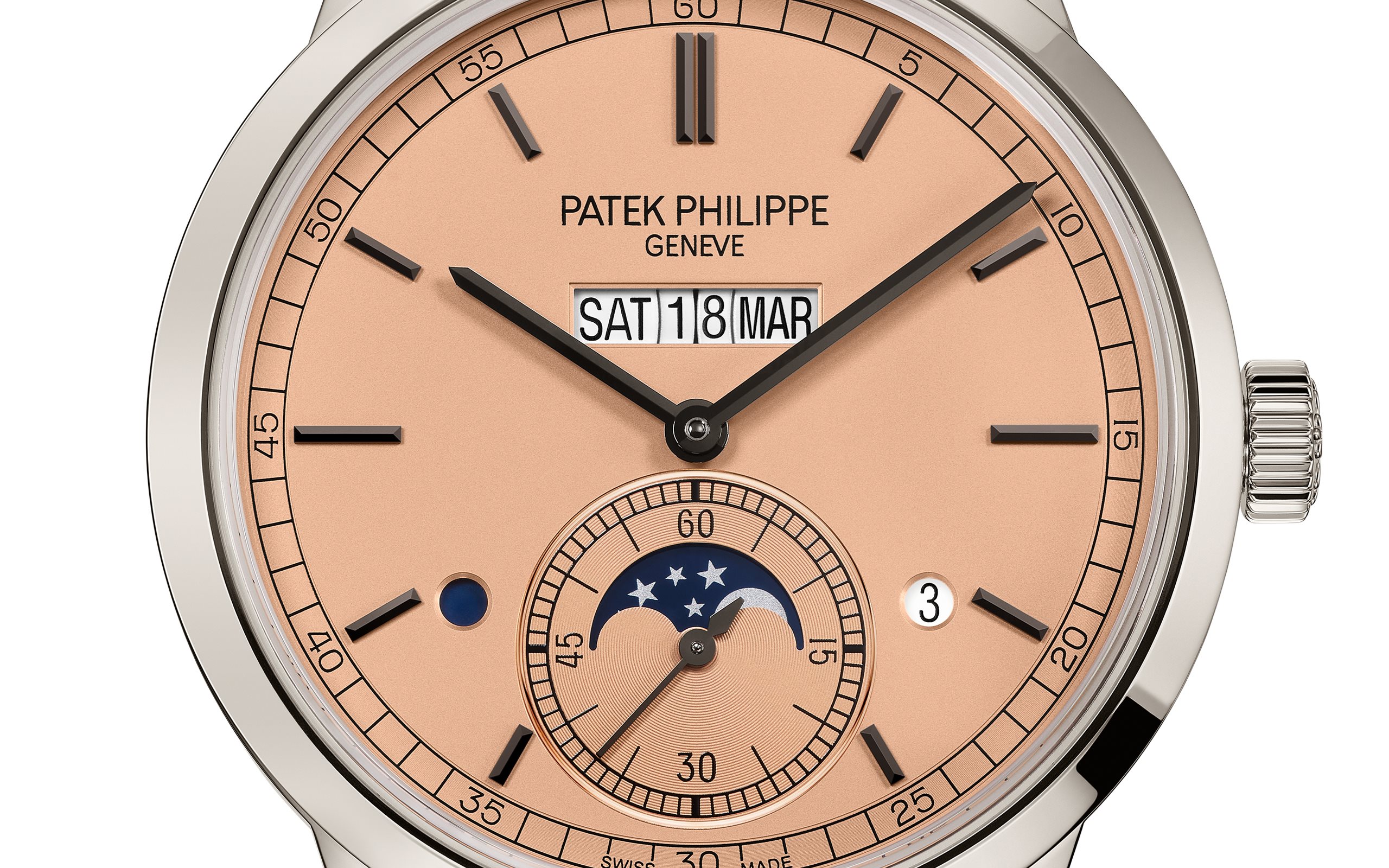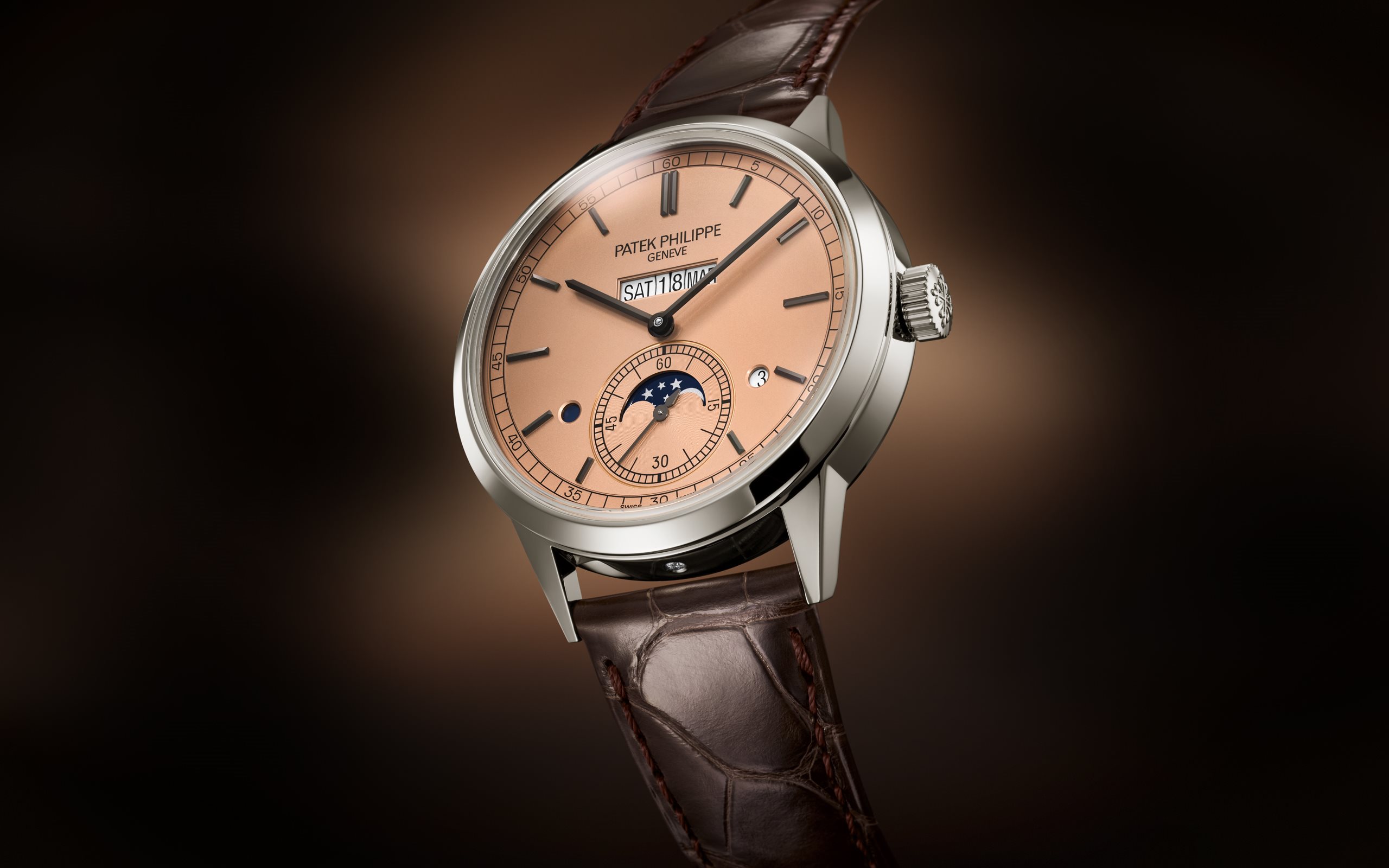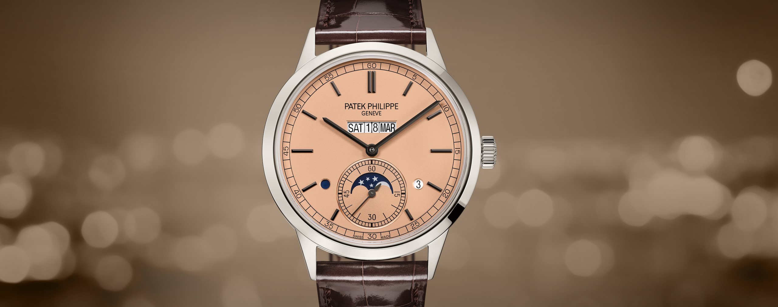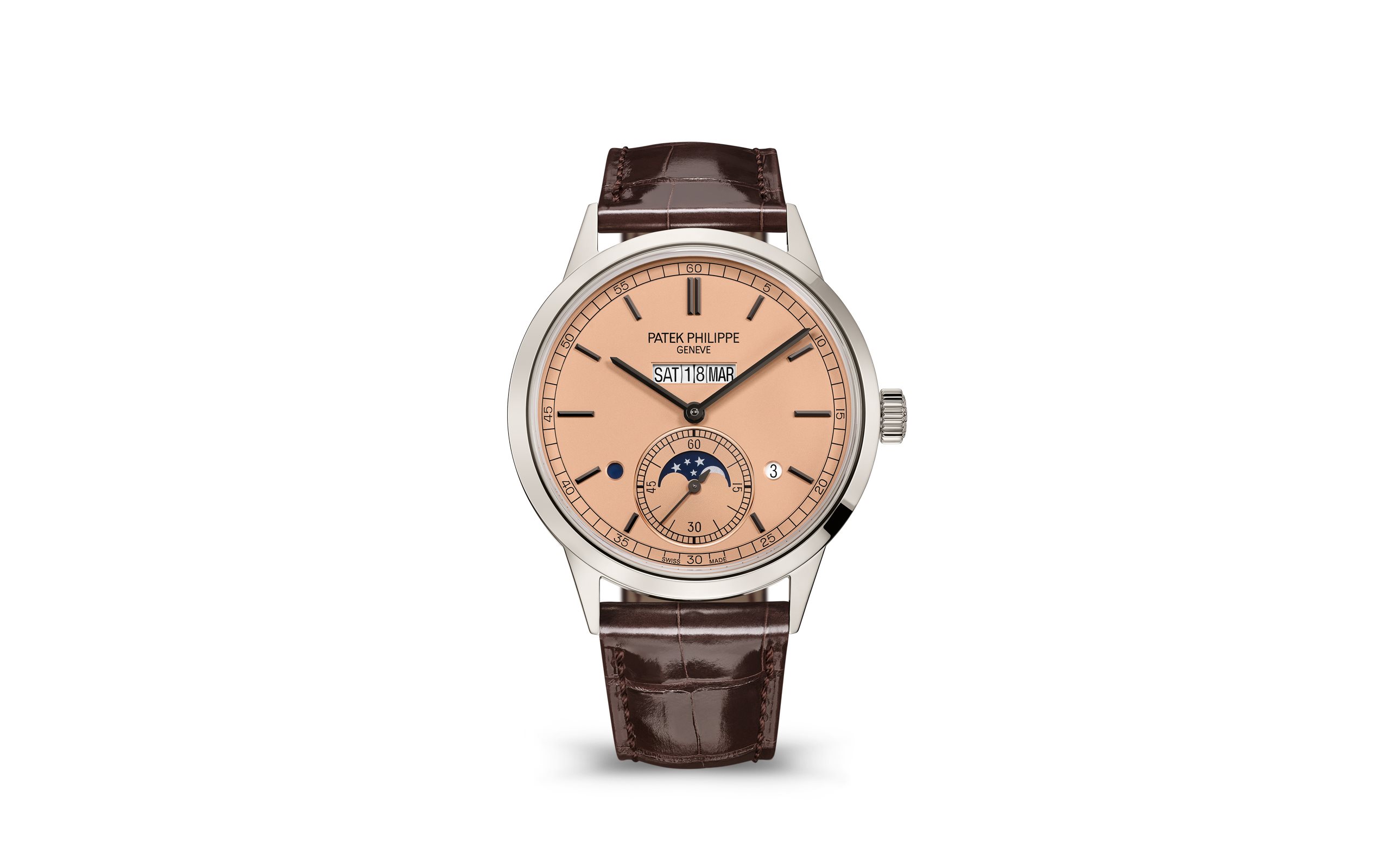 Patek Philippe revisits the in-line perpetual calendar Reference 5236P with a vintage-inspired opaline rose-gilt dial enhanced by charcoal gray white gold hands and applied hour-markers.