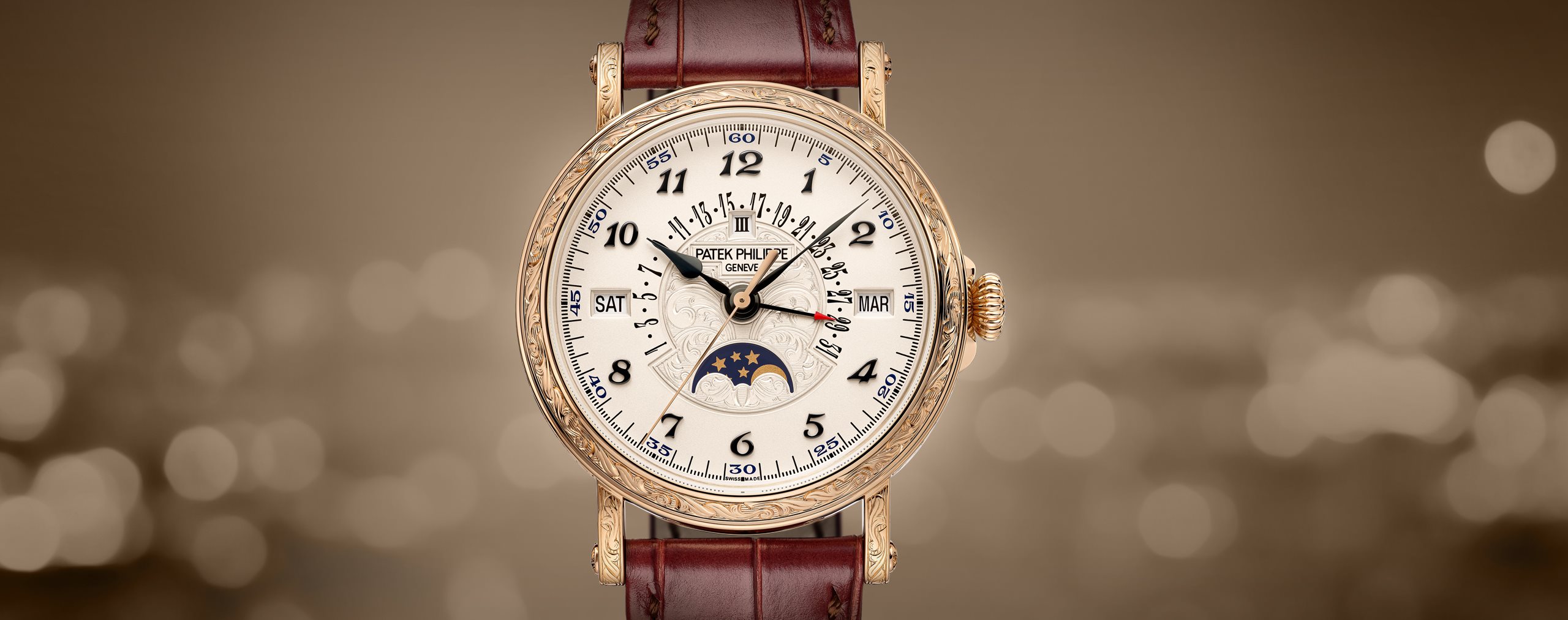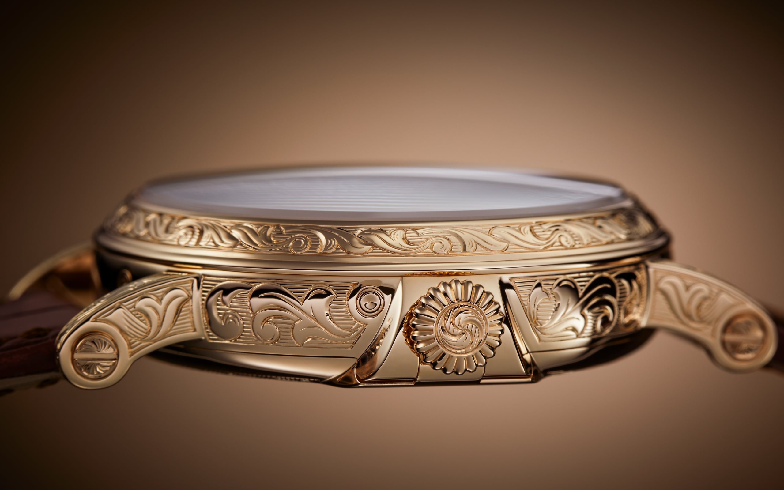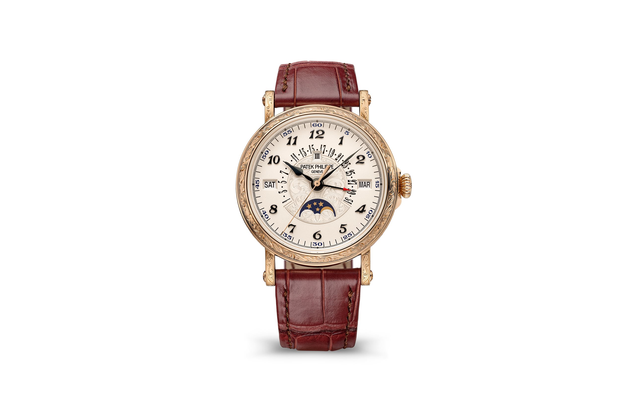 - Sapphire crystal case back protected by a hand-engraved hinged dust cover