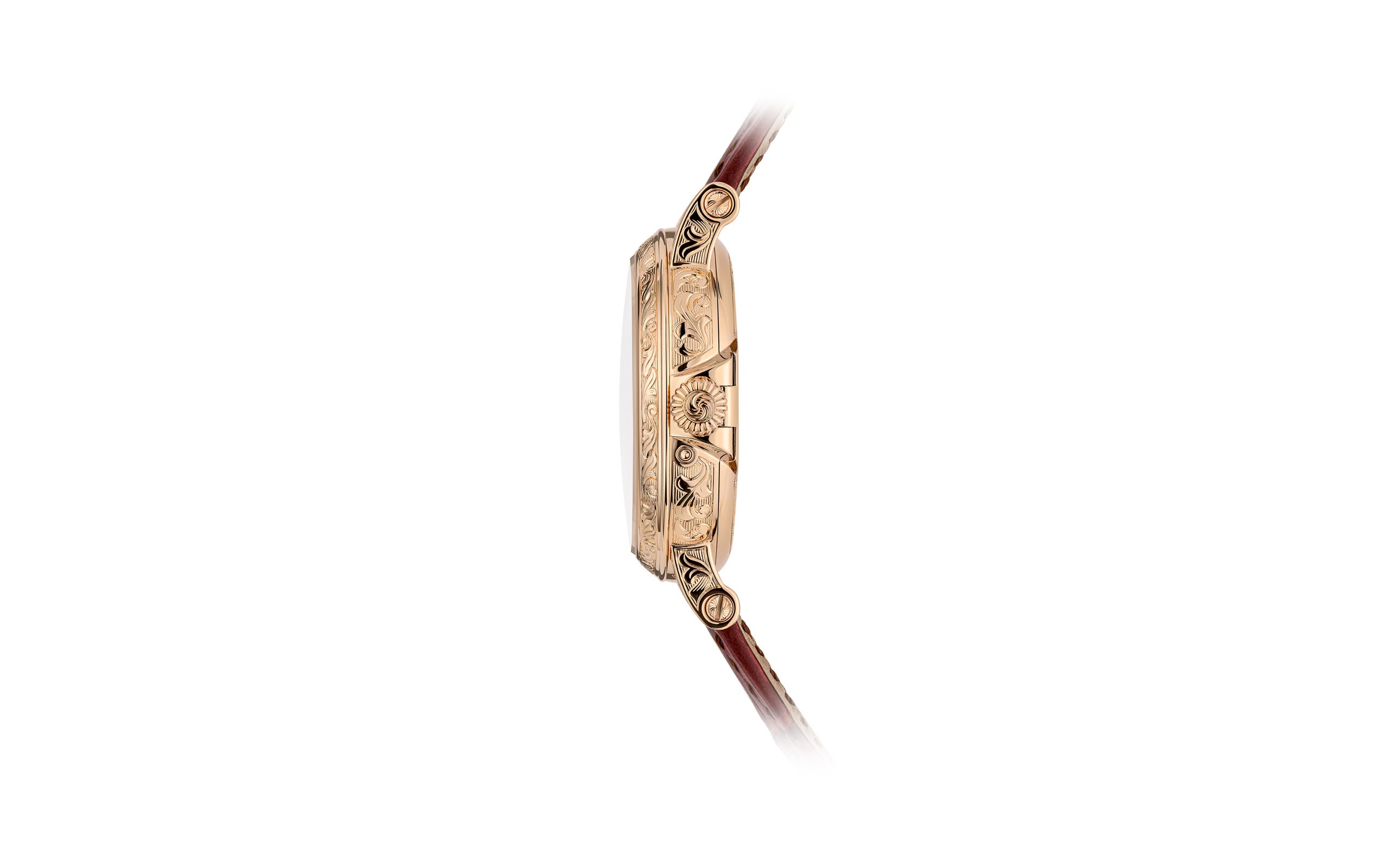 - Hand-engraved case, hinged cover, crown, lugs and screws