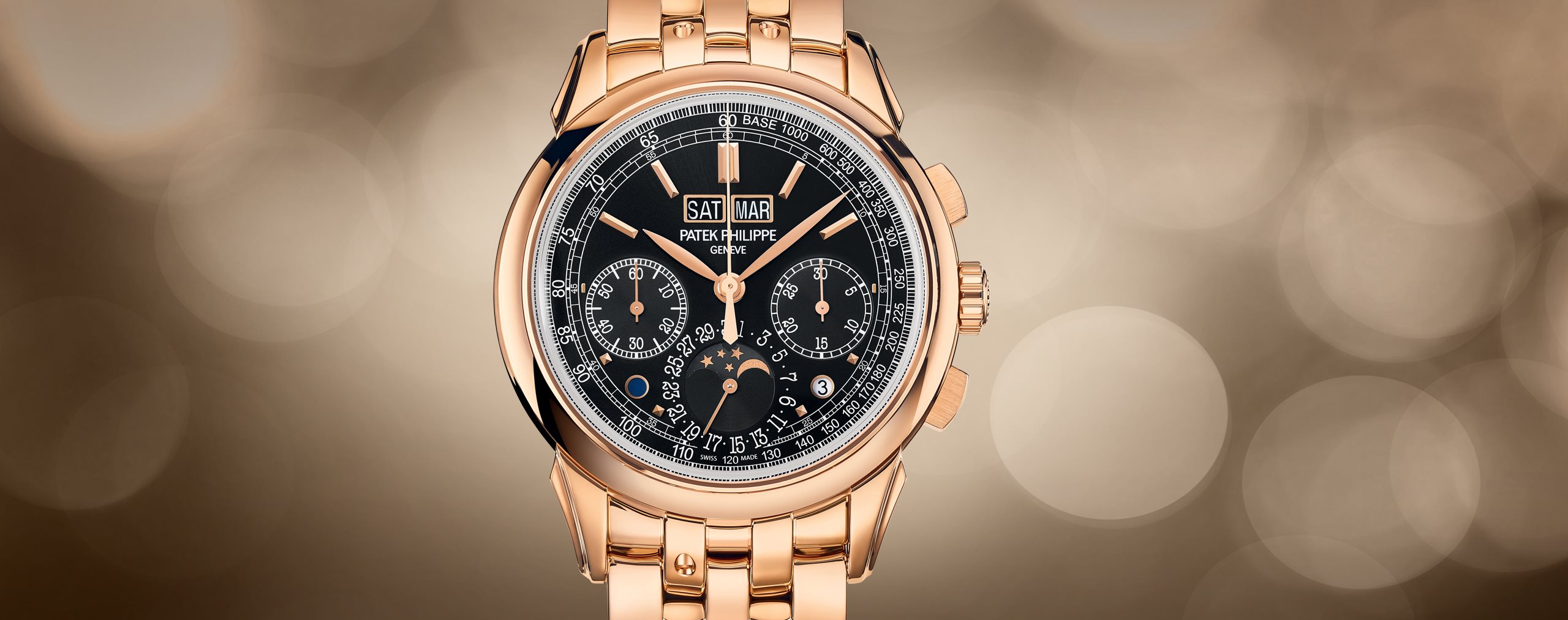 The men’s Reference 5270 perpetual calendar chronograph in rose gold features a gold “Goutte” bracelet that literally blends with the case: this design is exclusive to Patek Philippe. The ebony black sunburst dial is beautifully balanced and legible, with a double aperture for the day and the month at 12 o’clock and an analog date at 6 o’clock. The chronograph indications are accentuated with sandblasted hands.