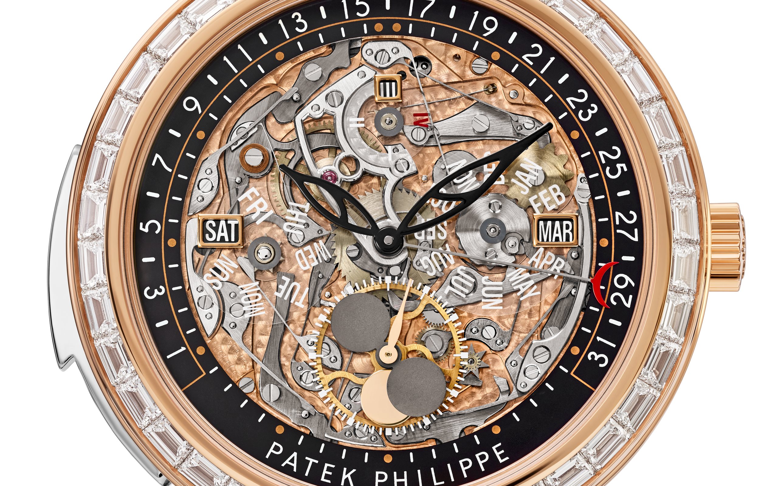 A miracle of transparency, the Reference 5304 self-winding Grand Complication with minute repeater and retrograde perpetual calendar is reinterpreted in a new rose gold version on which the bezel, lugs and fold-over clasp are enhanced with 80 baguette-cut diamonds (~6.22 cts). This sparkling touch highlights the ingenious calendar display system with sapphire disks. The "leaf" motif engraved on the white gold inserts adorning the sides of the case is echoed on the off-center rose gold mini-rotor visible through the transparent case back.
