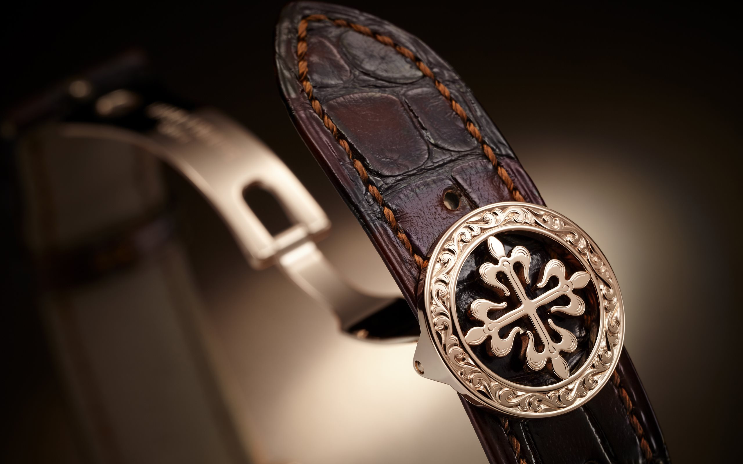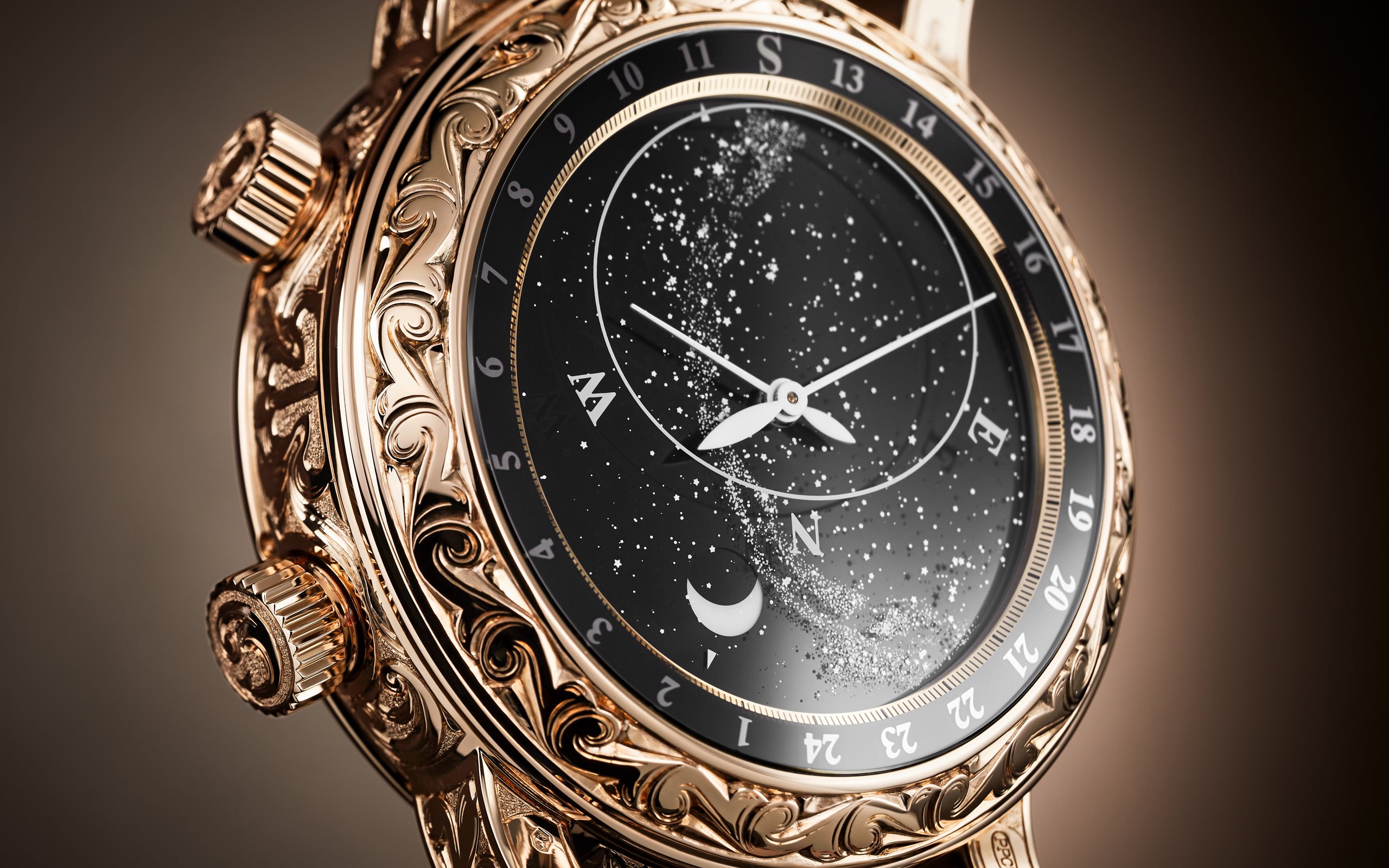 Patek Philippe gives the Reference 6002 Sky Moon Tourbillon a new look by combining the warm glow of rose gold with a Grand Feu brown enamel decoration. The double-faced case, crowns, slide piece, hour/minute hands and fold-over clasp are entirely hand-engraved with volutes and arabesques. The front dial combines Grand Feu champlevé and cloisonné enameling. This exceptional timepiece, the second most complicated Patek Philippe wristwatch (12 complications), is delivered with a pair of matching cufflinks.
