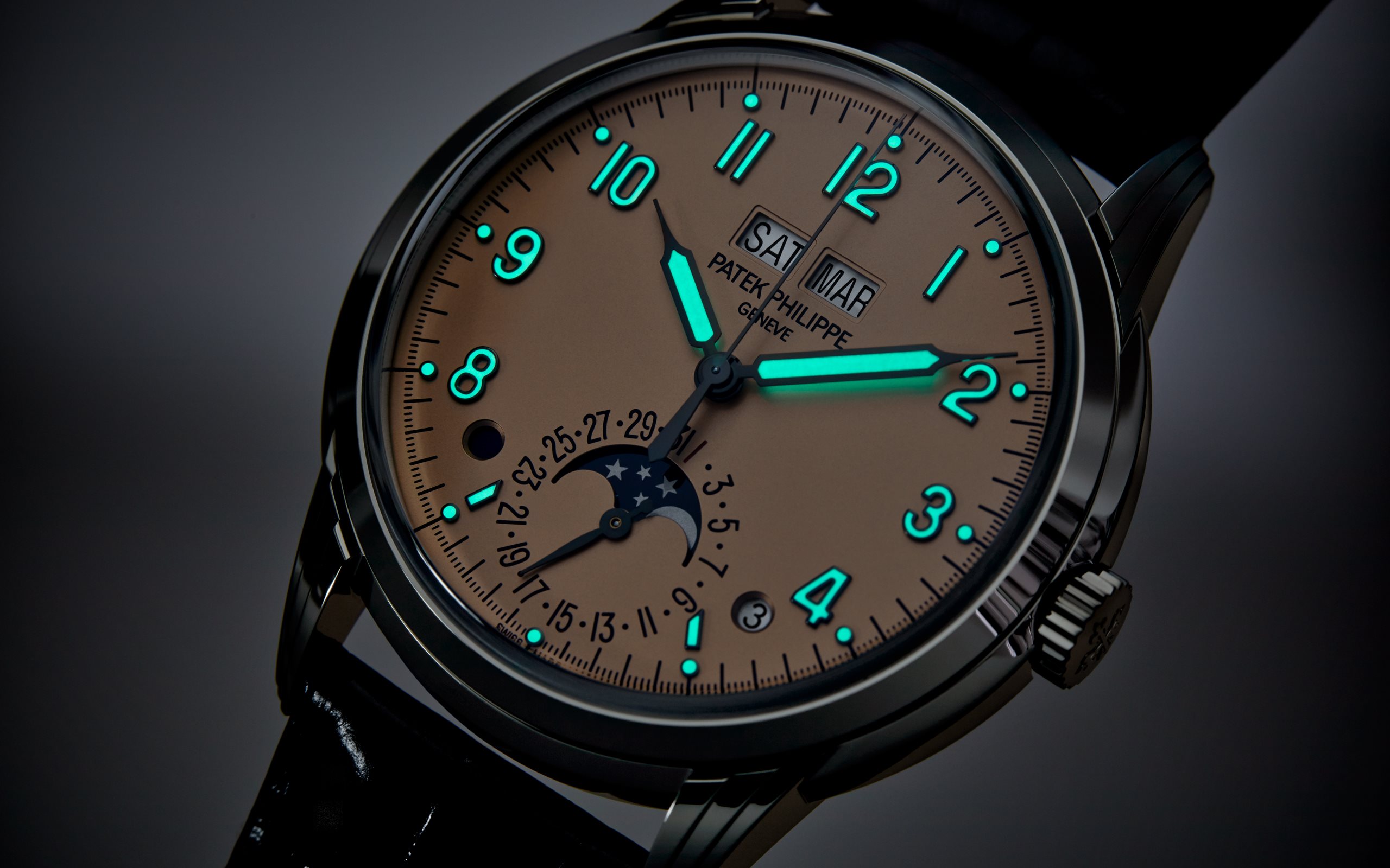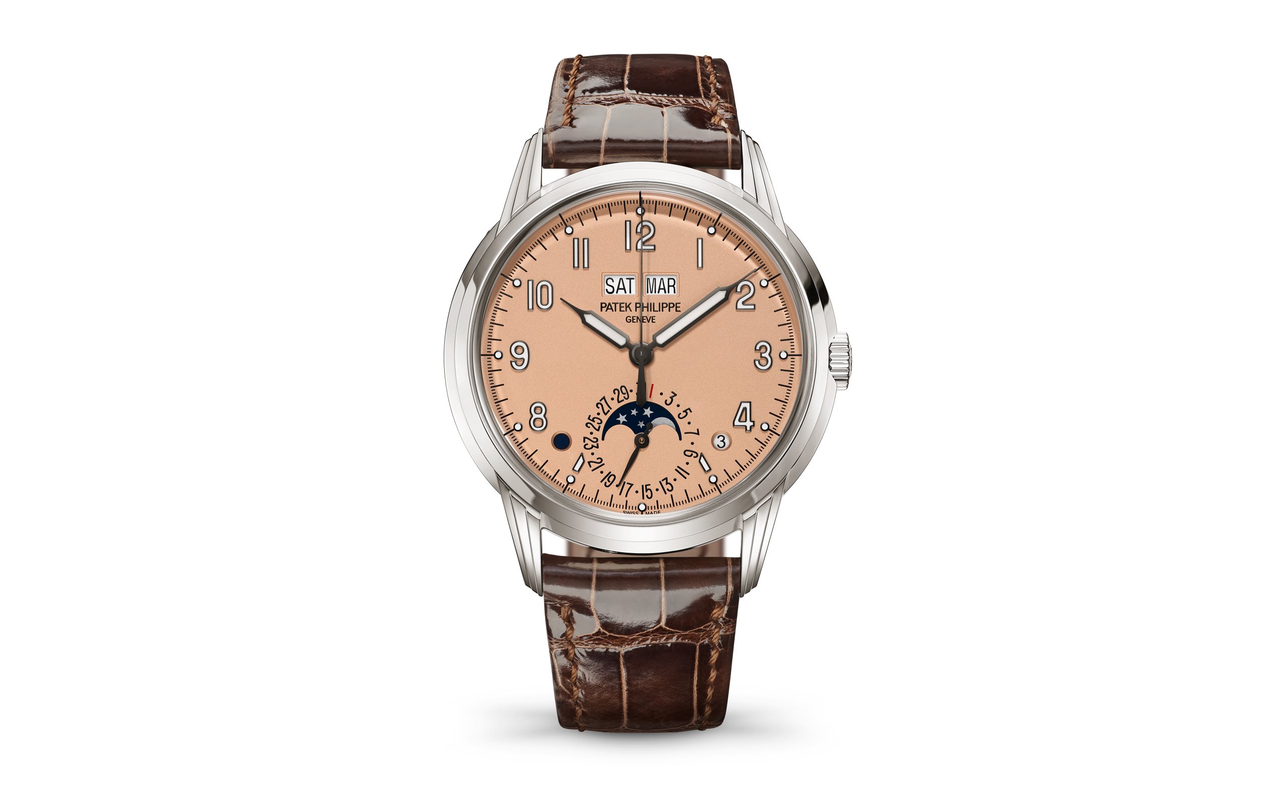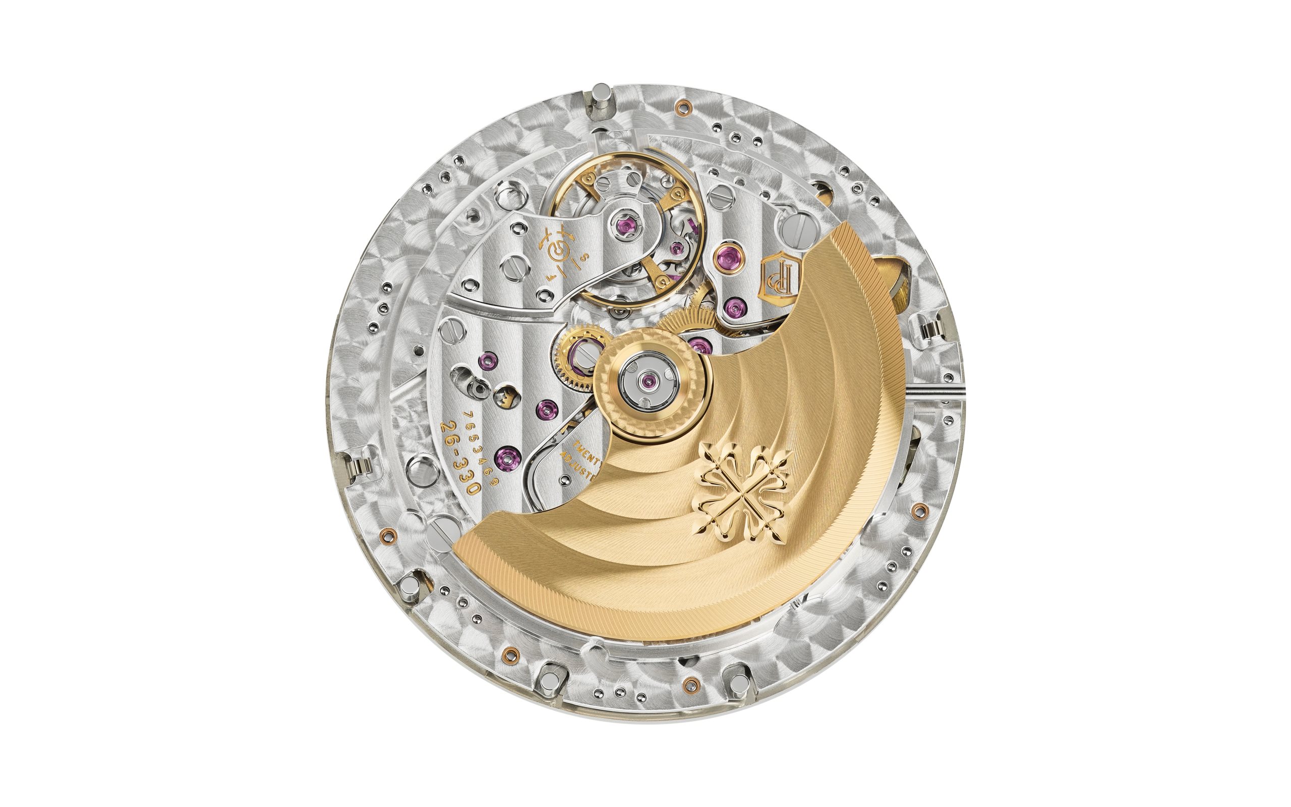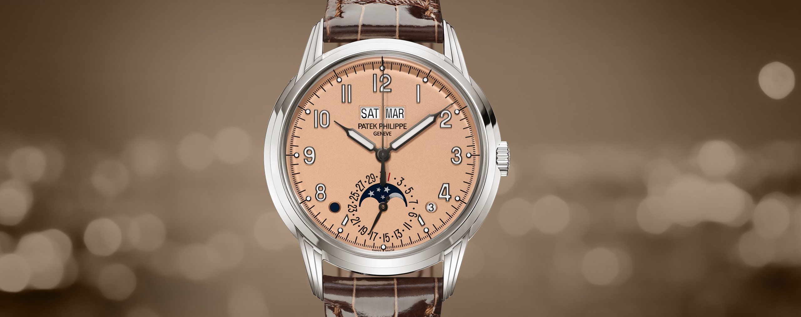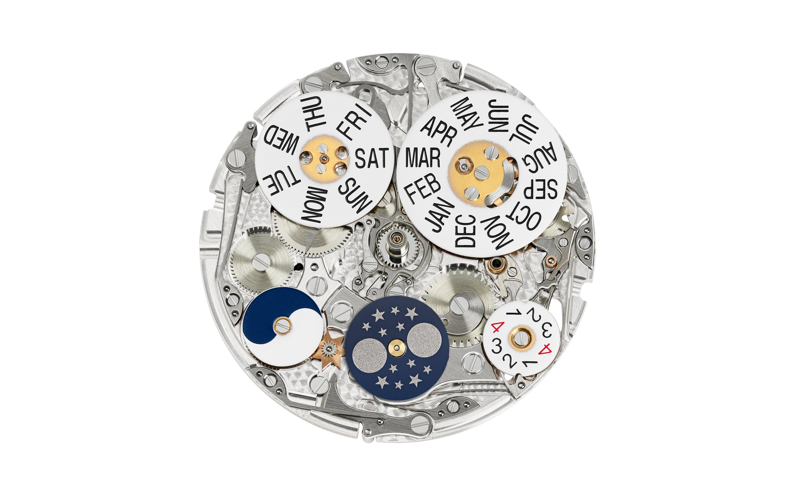 A paragon of visual balance and legibility, the perpetual calendar model bearing Reference 5320 was designed in 2017 in a white gold case with a cream-lacquered dial. Its vintage style is reinterpreted in a new white gold version fitted with a gilded opaline rose gold dial. The calendar displays are arranged in the characteristic manner of Patek Philippe perpetual calendar watches since 1941, with a twin in-line day/month aperture at 12 o’clock and a date indicated by a hand surrounding a moon-phase aperture at 6 o’clock. These are complemented by two round apertures: one for the day/night indication between 7 and 8 o’clock; and the other for the leap-year cycle between 4 and 5 o’clock E28094 both of which are useful to adjust the calendar. The extremely accurate moon phases require a one-day correction only once every 122 years.
