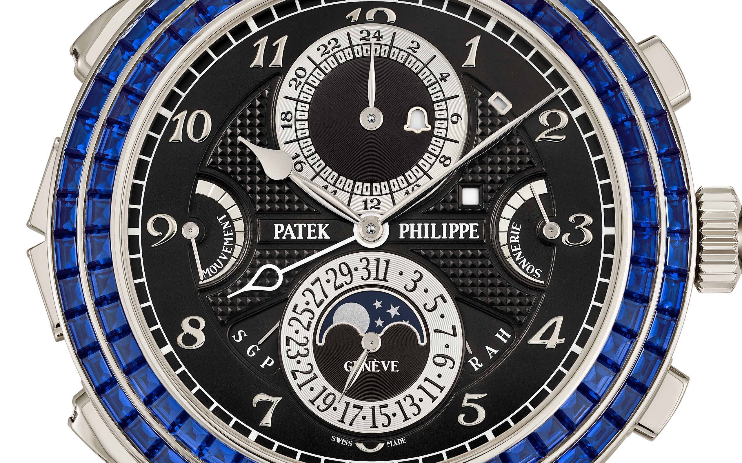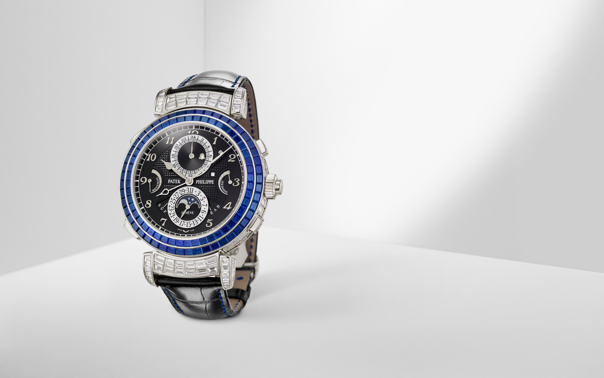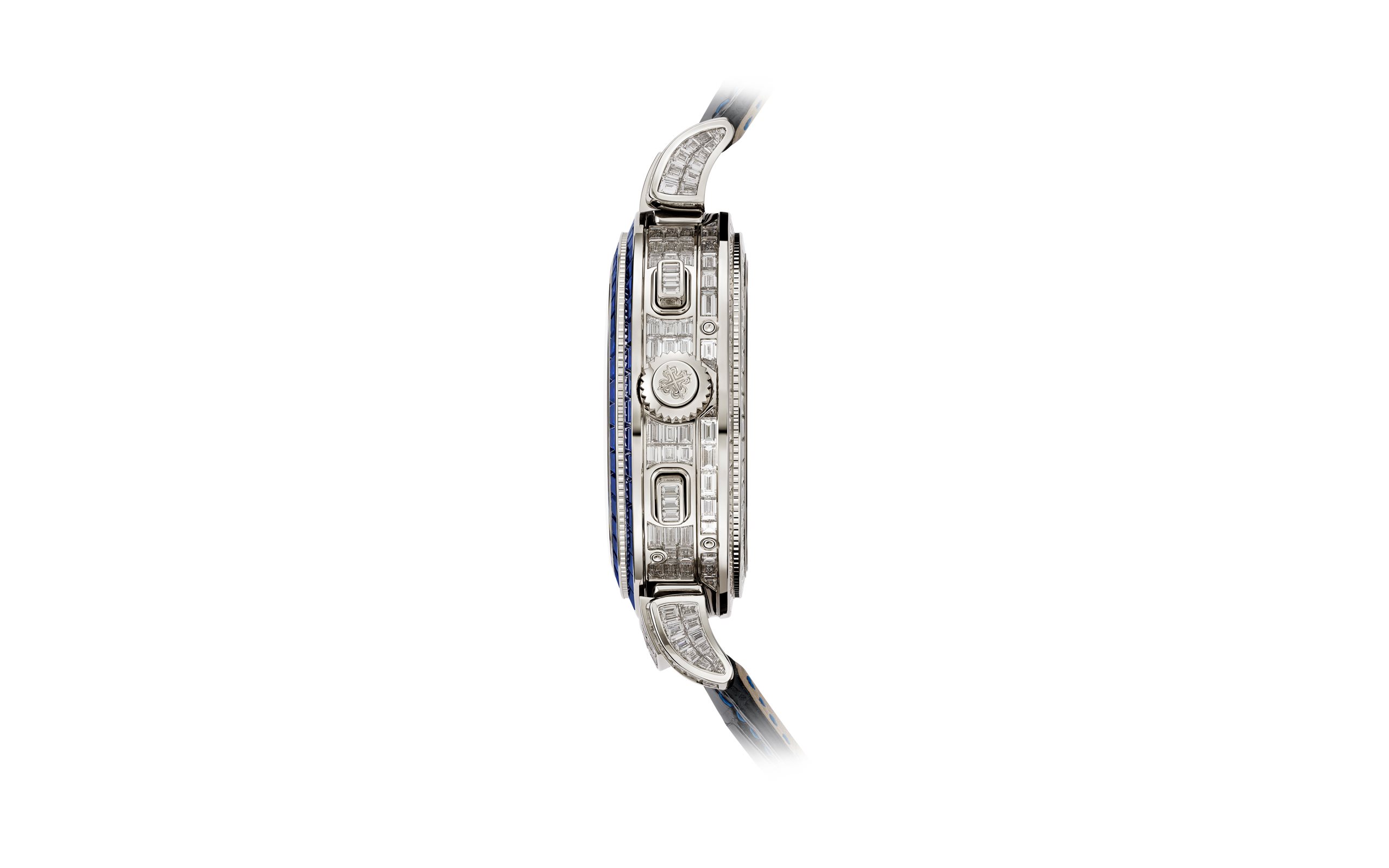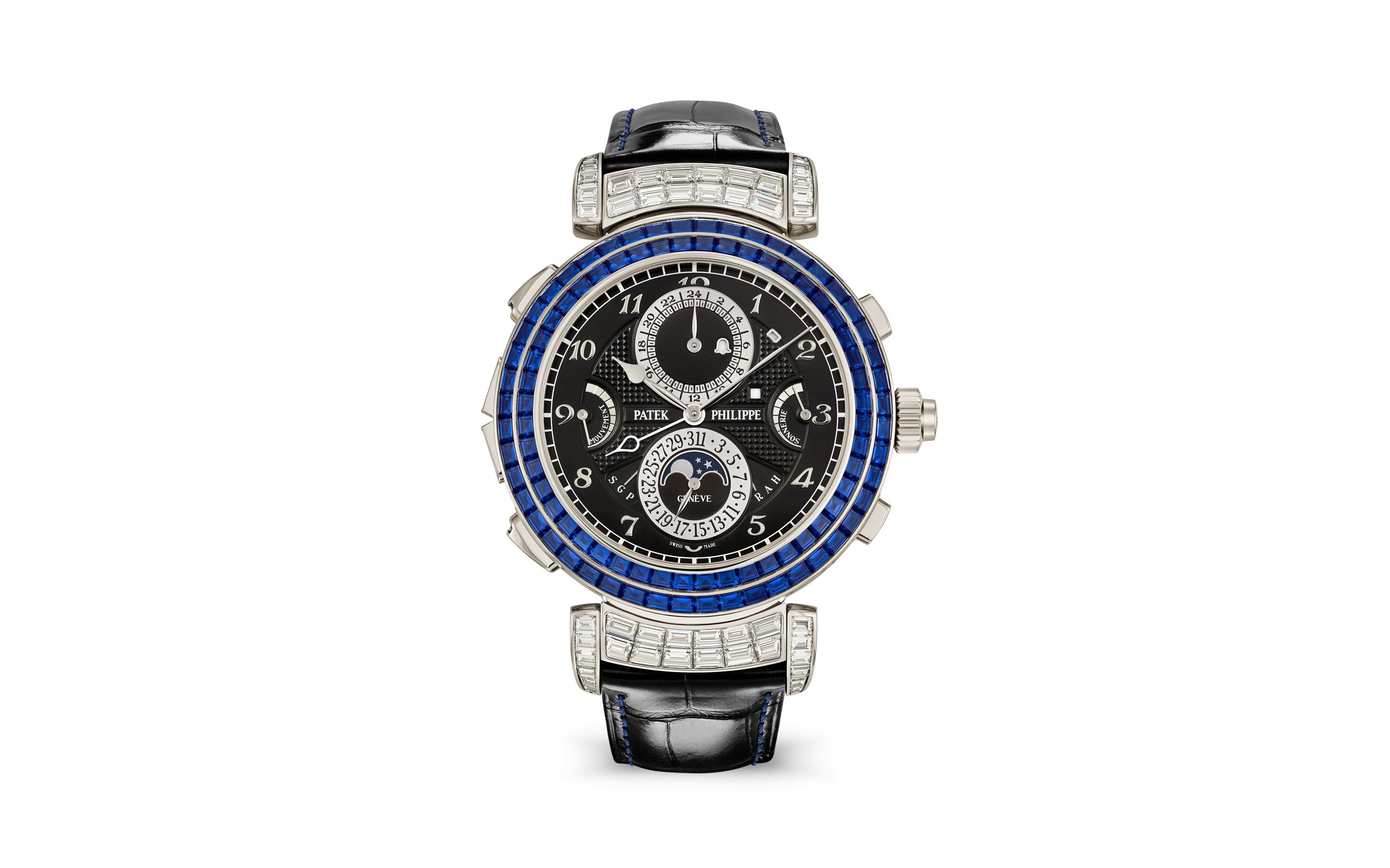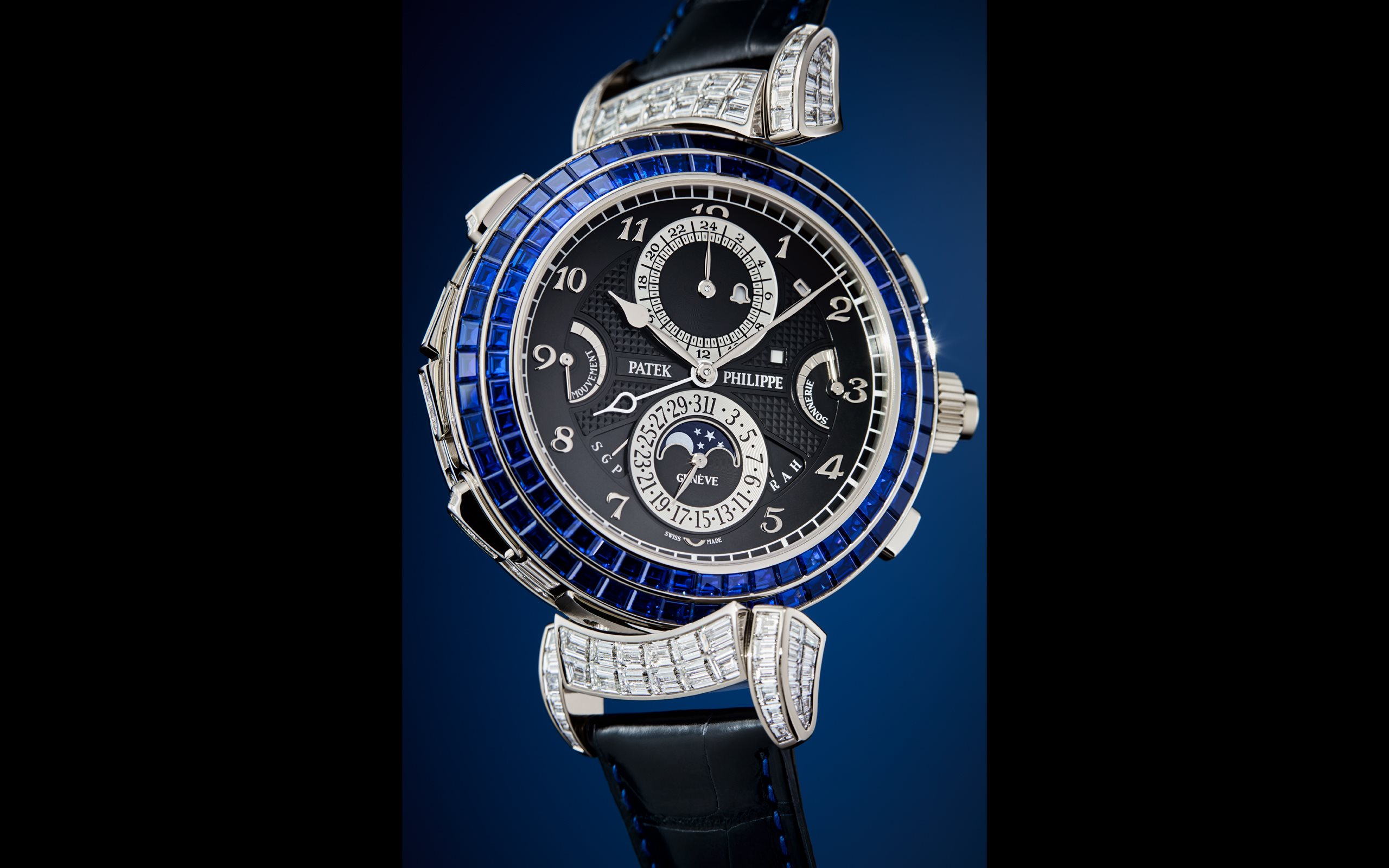 Patek Philippe combines Haute Horlogerie and Haute Joaillerie by reinterpreting its most complicated wristwatch in a white gold version set with 118 baguette-cut blue sapphires (11.9 cts) and 291 baguette-cut diamonds (20.54 cts), featuring the "invisible setting" technique.